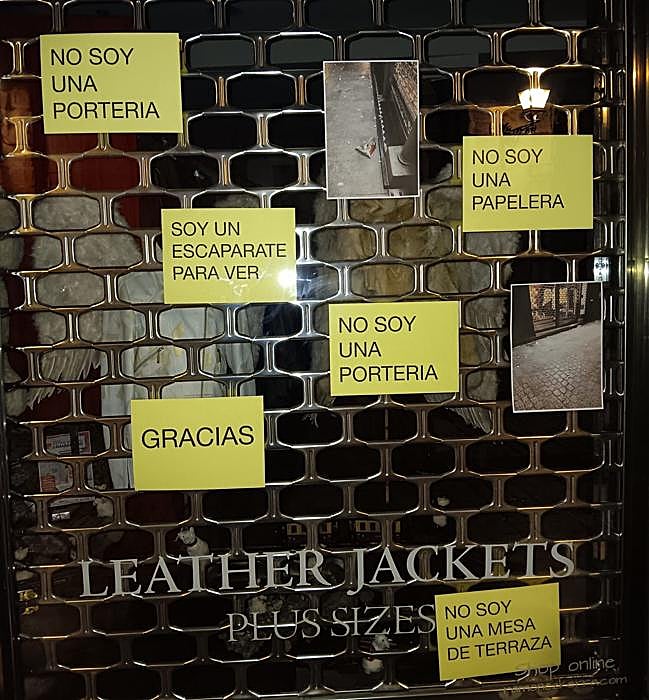 'No soy una papelera' (de la cantidad de desperdicios que dejan a la entrada del establecimiento), 'No soy una portería' (la mar de pelotazos que soporta todos los fines de semana la cristalera de su exitoso comercio), 'No soy una mesa de terraza' (pese a parecer el exterior de un bar), 'Soy un escaparate para ver' y un 'Gracias'. Ironía, como ven, no le falta.