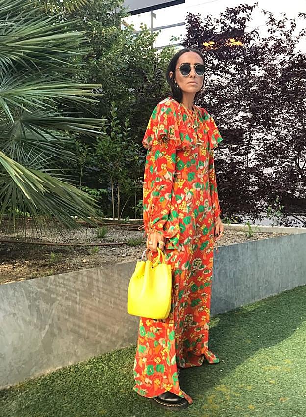 En los looks de Laura conviven en armonía las mezclas de colores, estampados y conceptos. En este caso, apuesta por un vestido fluido con estampado de flores y maxivolante, firmado por Mango. Lo combina con un bolso de mano amarillo y las botas que nunca habríamos esperado para un look de estética bohemia como este: unas Dr. Martens que consiguen dar un giro inesperado y muy interesante.