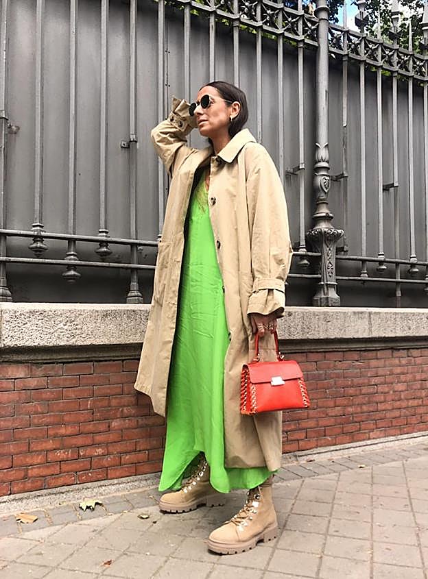 En este último look, la vitoriana desmonta el mito del 'slip-dress', comunmente asociado a las sandalias, al verano y a un favorecedor bronceado. Sin embargo, ella lo adapta al entretiempo jugando con prendas opuestas como una gabardina 'oversize' de Zara, un bolso de piel de Uterqüe y unas botas acordonadas de estilo militar con suela 'track'.