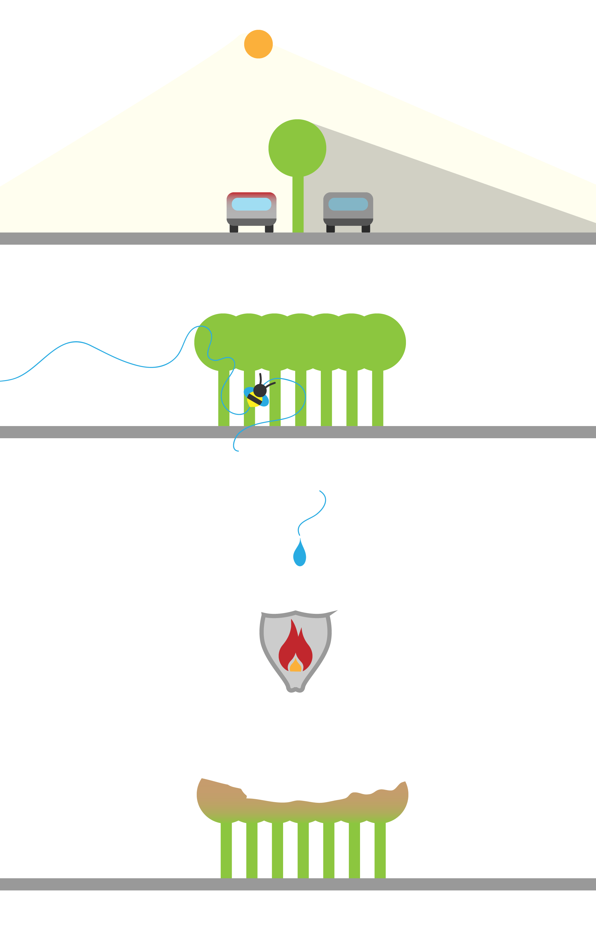 La pérdida del arbolado urbano influirá también en la función que estas plantas juegan en el mantenimiento de la diversidad, la polinización, la alimentación animal, la dispersión de semillas, la regulación de organismos perjudiciales para los humanos (partículas, patógenos...), la prevención de la erosión y la fertilidad del suelo y el control hídrico.
