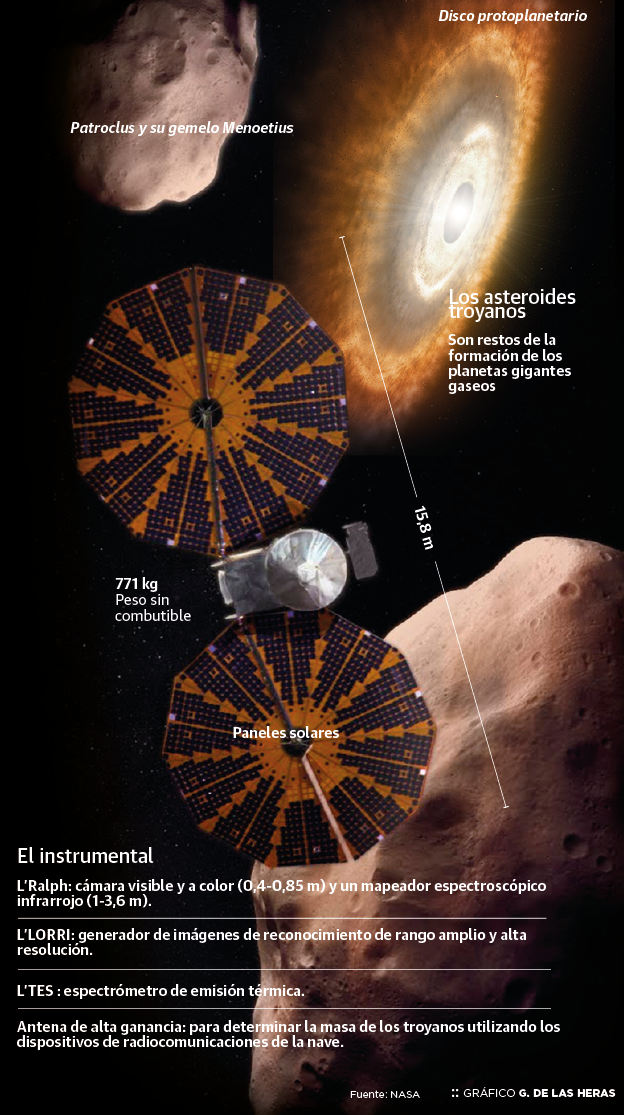 «Los asteroides troyanos han sido testigos de primera mano de la historia del Sistema Solar exterior. Por lo tanto, nos presentan una oportunidad única para comprender mejor la formación de planetas y la evolución del Sistema Solar», dice Sherry Jennings, directora de la misión. 'Lucy' seguirá en su viaje una trayectoria oportunista, dictada por la mecánica celeste, para visitar el mayor número posible de cuerpos. Es la misión espacial con más objetivos de la historia: un asteroide del Cinturón y siete troyanos formados en diferentes partes del disco protoplanetario hace 4.500 millones de años. De los 16 metros de anchura de la nave, 14,6 corresponden a sus dos paneles solares -decagonales y de 7,3 metros de diámetro cada uno-, necesarios para generar 500 vatios de energía tan lejos del Sol como va a llegar.