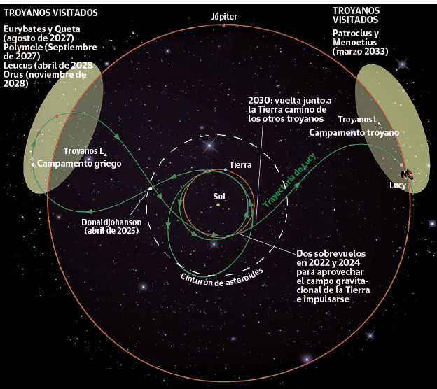 Un pequeño homínido al encuentro de los héroes de la guerra de Troya en una misión extraordinariamente compleja. Durante doce años, la sonda espacial 'Lucy' -bautizada así por un fósil clave en la evolución humana- intentará desentrañar los secretos que sobre los orígenes del Sistema Solar guardan los llamados asteroides troyanos. Para ello, tras su lanzamiento el pasado 16 de octubre recorrerá más de 6.300 millones de kilómetros, visitará ocho asteroides, sobrevolará tres veces la Tierra para acelerar y, en diciembre de 2030, se convertirá en la primera nave en volver a las inmediaciones de nuestro planeta desde el Sistema Solar exterior.