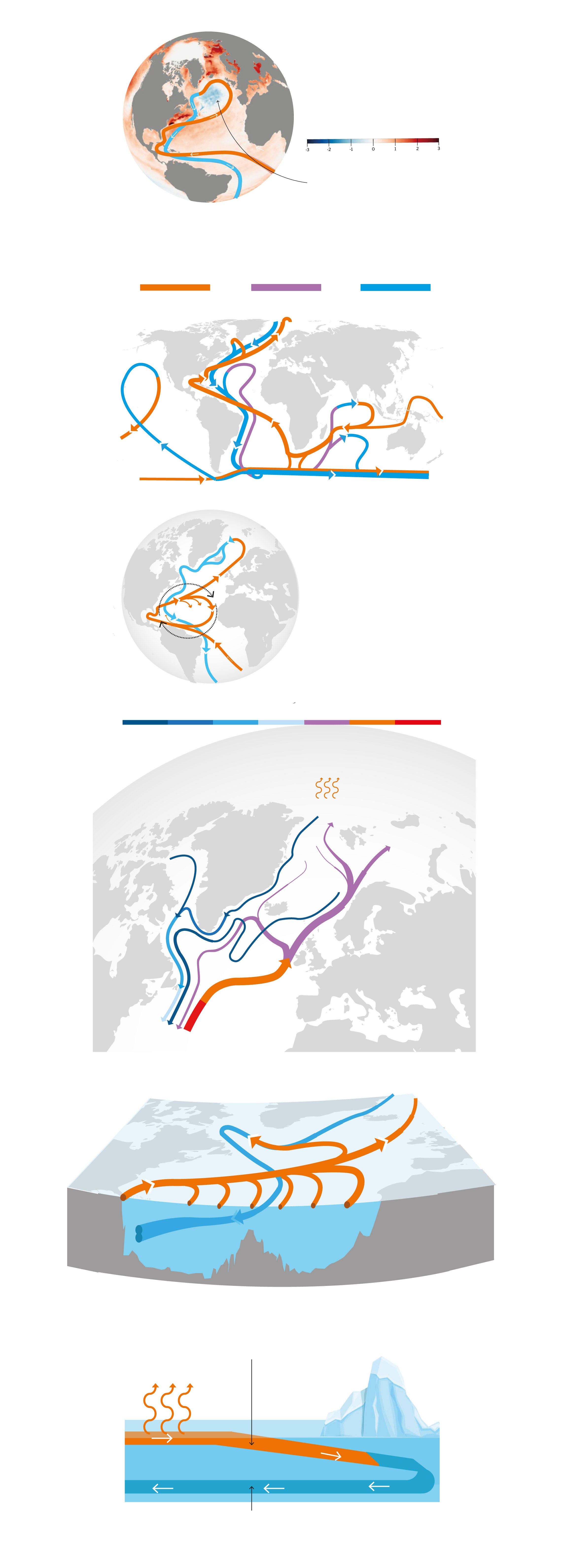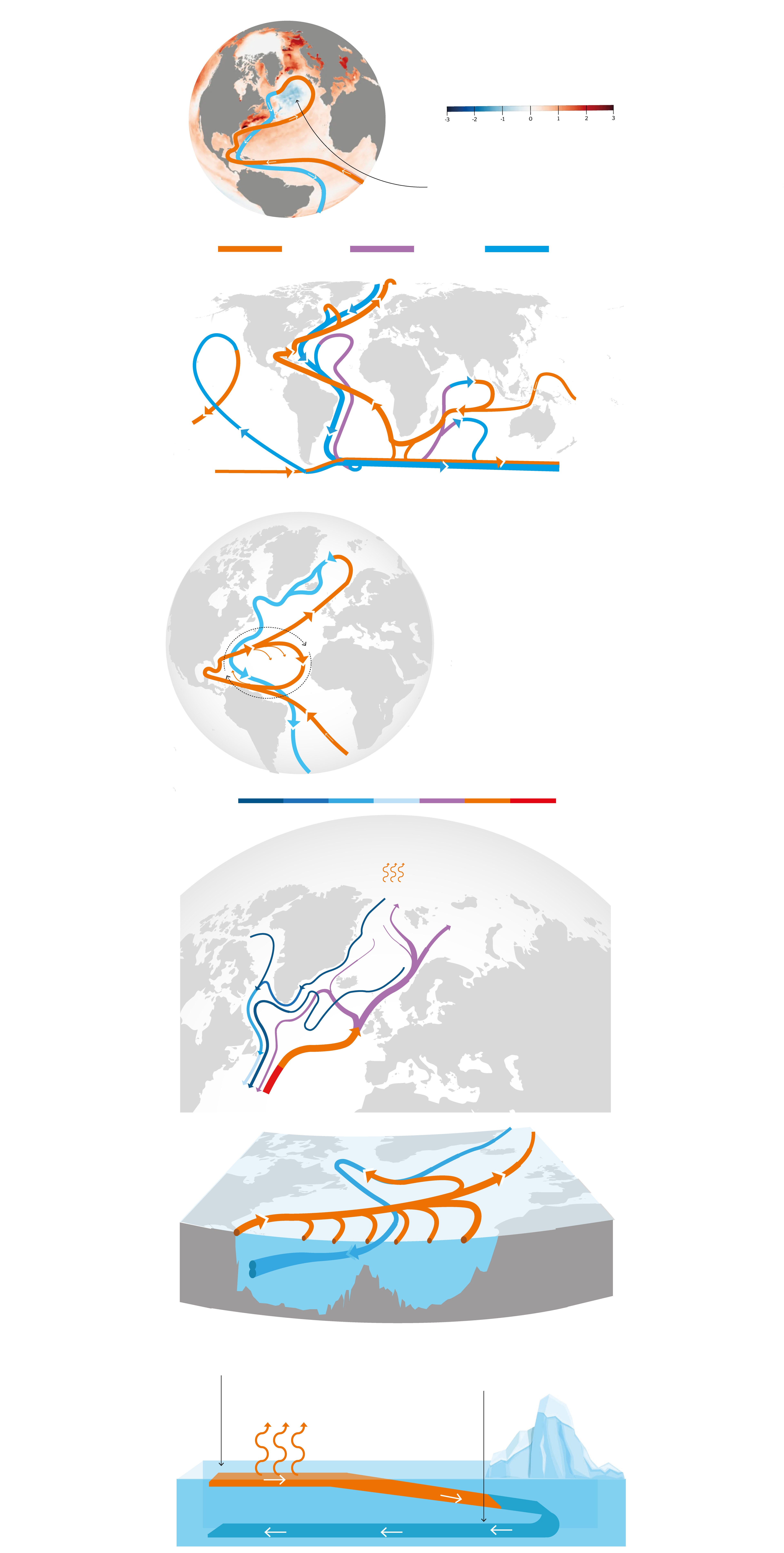 La parte de la corriente global que atraviesa el Atlántico se conoce como Circulación Meridional del Atlántico. Es una especie de ‘8’ que lleva el agua caliente desde África hasta el Caribe y EE UU para después ir a Europa. Desde aquí, llega al Polo Norte, donde se enfría y desciende.