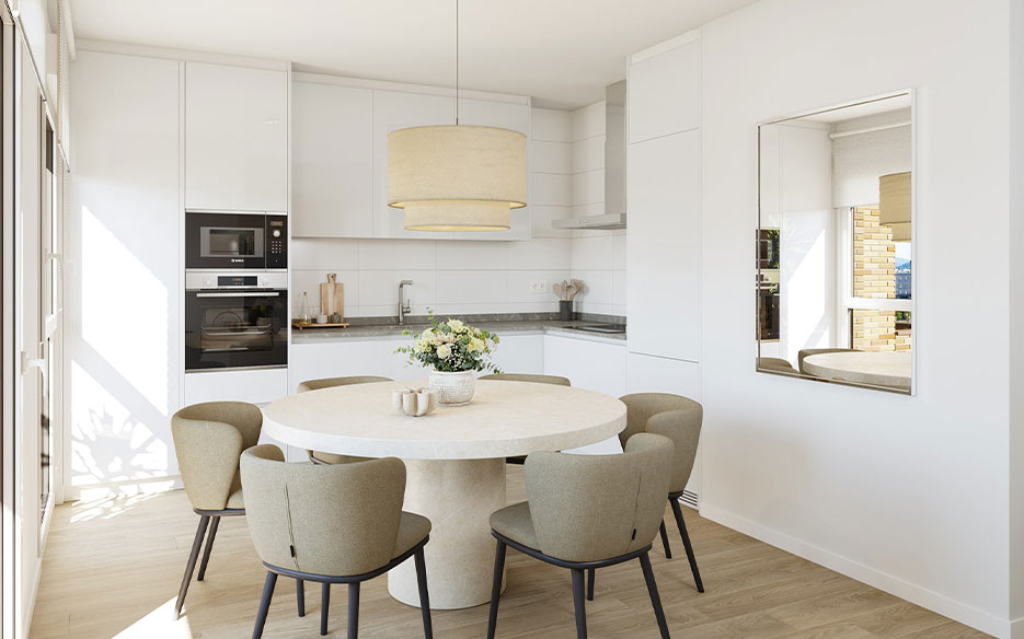 Las viviendas han sido diseñadas con criterios de eficiencia, confort y luminosidad. Sus amplios ventanales y orientaciones privilegiadas permiten aprovechar al máximo la luz natural y las vistas hacia el pulmón verde de la ciudad. En su interior, los espacios de día se conciben de forma abierta: salón y cocina se comunican de manera fluida, generando amplitud y continuidad visual con las terrazas exteriores.