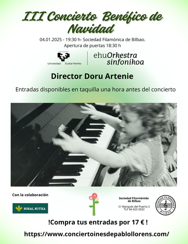 El día 4 de enero de 2025, en la Sociedad Filarmónica de Bilbao, tendrá lugar el III Concierto de Navidad Inés de Pablo Llorens con la finalidad de seguir recaudando fondos para la investigación contra el cáncer organizado por la Asociación Inés de Pablo Llorens.