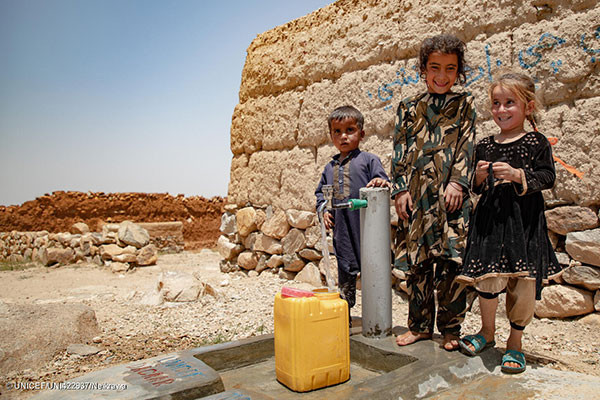 Loqman de 3 años, Palwasha de 5 años y Gulalai de 4 años sonríen frente a la fuente de agua limpia que recientemente Unicef, gracias al apoyo de sus aliados, ha puesto en funcionamiento con energía solar en Tooragha Village, Afganistán. Antes no tenían acceso a agua potable en su pueblo y las familias, sobre todo mujeres, niñas y niños, caminaban hasta el riachuelo más cercano, a 90 minutos andando, para conseguirla. Los peligros de la caminata diaria o las enfermedades provocadas por el consumo de agua en malas condiciones afectaban gravemente a la salud de la población infantil.