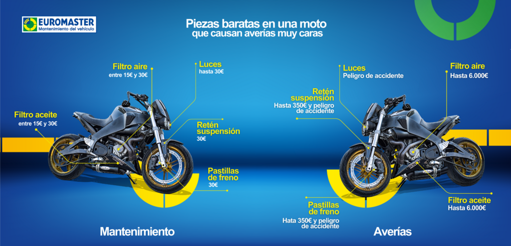 Luces: Las luces, cuyo coste en su sustitución no vale más de 30 euros, es otro de los componentes clave a revisar y vigilar. En este caso, lo realmente importante es la seguridad del motorista, más que su “bolsillo”, ya que este elemento permite su correcta visión de la carretera y que sean vistos por otros vehículos. Al respecto, hay que recordar que la legislación española obliga a las motos llevar encendidas las luces las 24 horas del día, de tal forma que son muchas las probabilidades de que se fundan al estar en todo momento en funcionamiento.