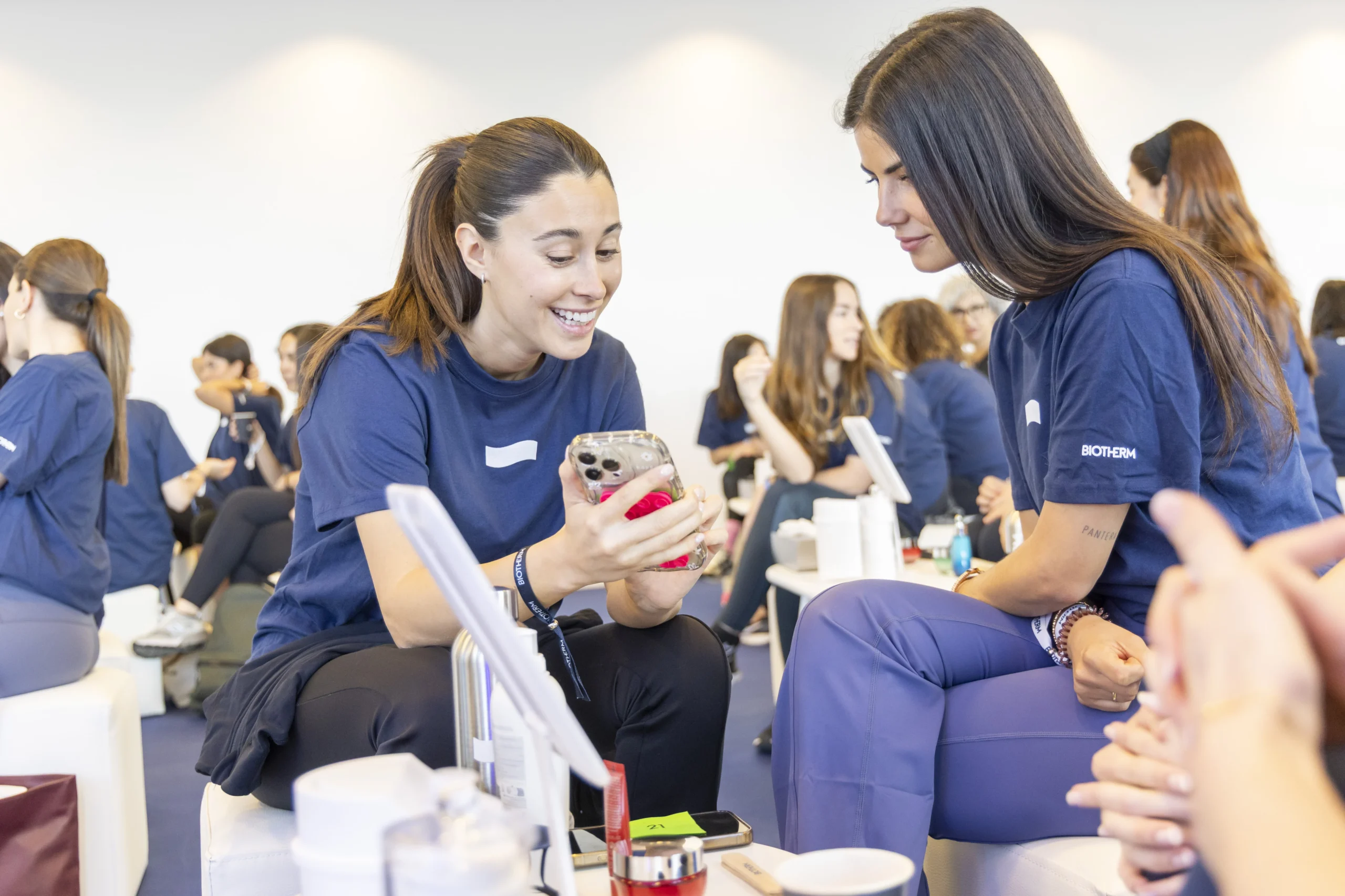 Coco Constans (@ffitcoco en redes sociales) embajadora de Biotherm, instructora de pilates y creadora del método Ffitpilates, fue la siguiente en subir al estrado. Sentadas en sus pufs, las asistentes escuchaban frente a diversas mesas donde descansaban algunos de los productos -como Aquasource Hyalu Plum Gel o el serum regenerador Life Plankton de Biotherm- que más tarde podrían conocer de primera mano. “Para mí la piel es un tesoro”, revelaba Coco, “y los tesoros, si no los cuidas, pierden valor. El skincare es un momento muy mío del día y absolutamente imprescindible”. Reflexionaba cómo este momento íntimo ha ido evolucionando a lo largo de los últimos años, y no se refería sólo a sí misma: “yo creo que antes era un paso automático, algo que hay que hacer. Ahora es algo que disfrutas: eliges el producto, lo sientes en la piel, dejas que se absorba…”.