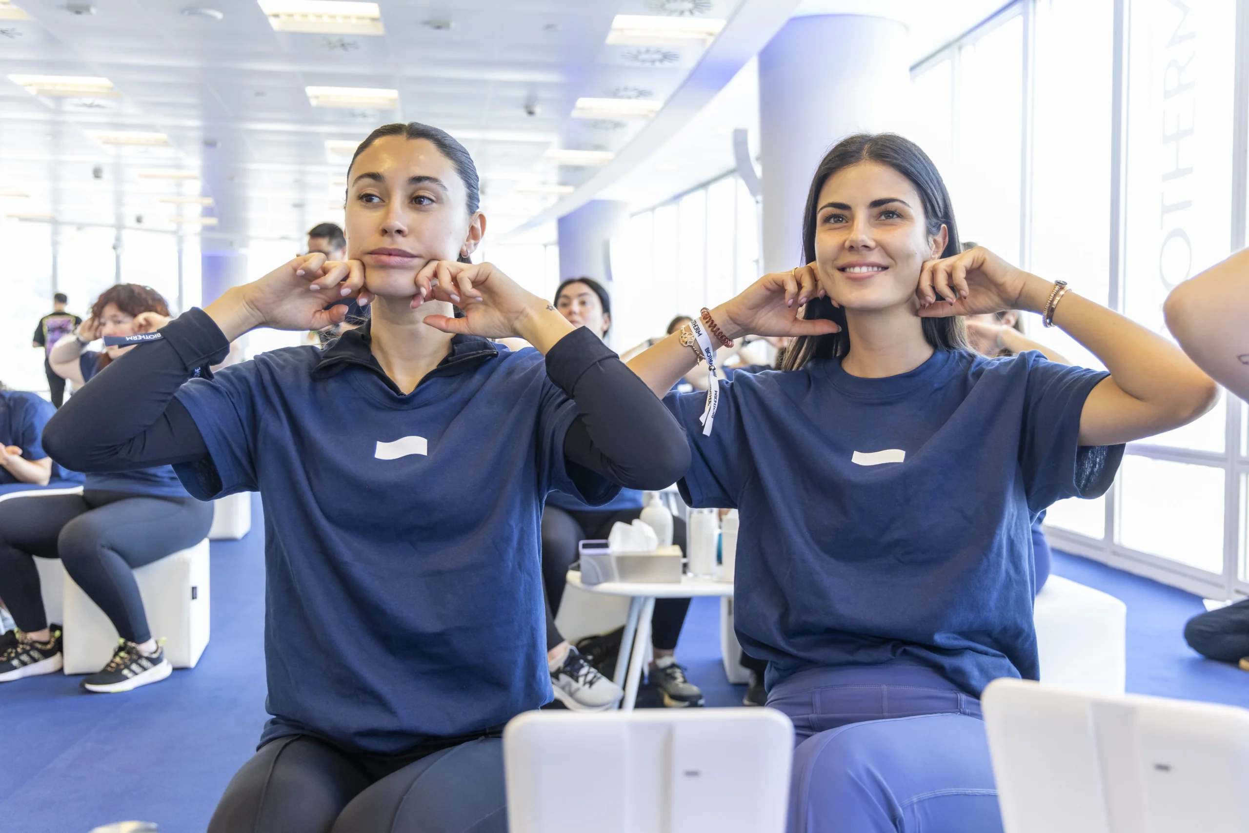 Y esto no fue todo. Todos y cada uno de los asistentes, independientemente de la actividad elegida, pudieron disfrutar de talleres y sesiones individuales de diagnóstico de su piel. Para testear en su propia piel los productos de skincare de Biotherm, nada mejor que los diversos talleres de texturas impartidos por dos expertas de lujo: Vanessa Fernández, directora de formación de skincare y Patricia Bendito, experta en yoga facial. “Lo que hemos hecho aquí es una sesión de entrenamiento facial, acompañado de producto, porque la piel tiene que estar muy hidratada”, en palabras de esta última, fundadora de la Escuela Internacional de yoga Facial MyFaceYoga. “Los músculos del rostro también los entrenamos” asegura, “igual que los del cuerpo. Y Biotherm es una marca pionera en todo lo que es rutinas de entrenamiento, corporal y facial”. Explicó cómo aprovechar ese momento de autocuidado que es el skincare para, al aplicar los productos, aprovechar para ir haciendo automasajes, drenajes… “Puedes ir esculpiendo el rostro con la piedra de gua sha que hemos usado hoy aquí. Es una herramienta de la medicina tradicional china que también se puede usar a nivel de belleza, porque tiene un efecto muy bueno sobre la piel: ayuda a conseguir ese efecto lifting, de alisado”, explica.