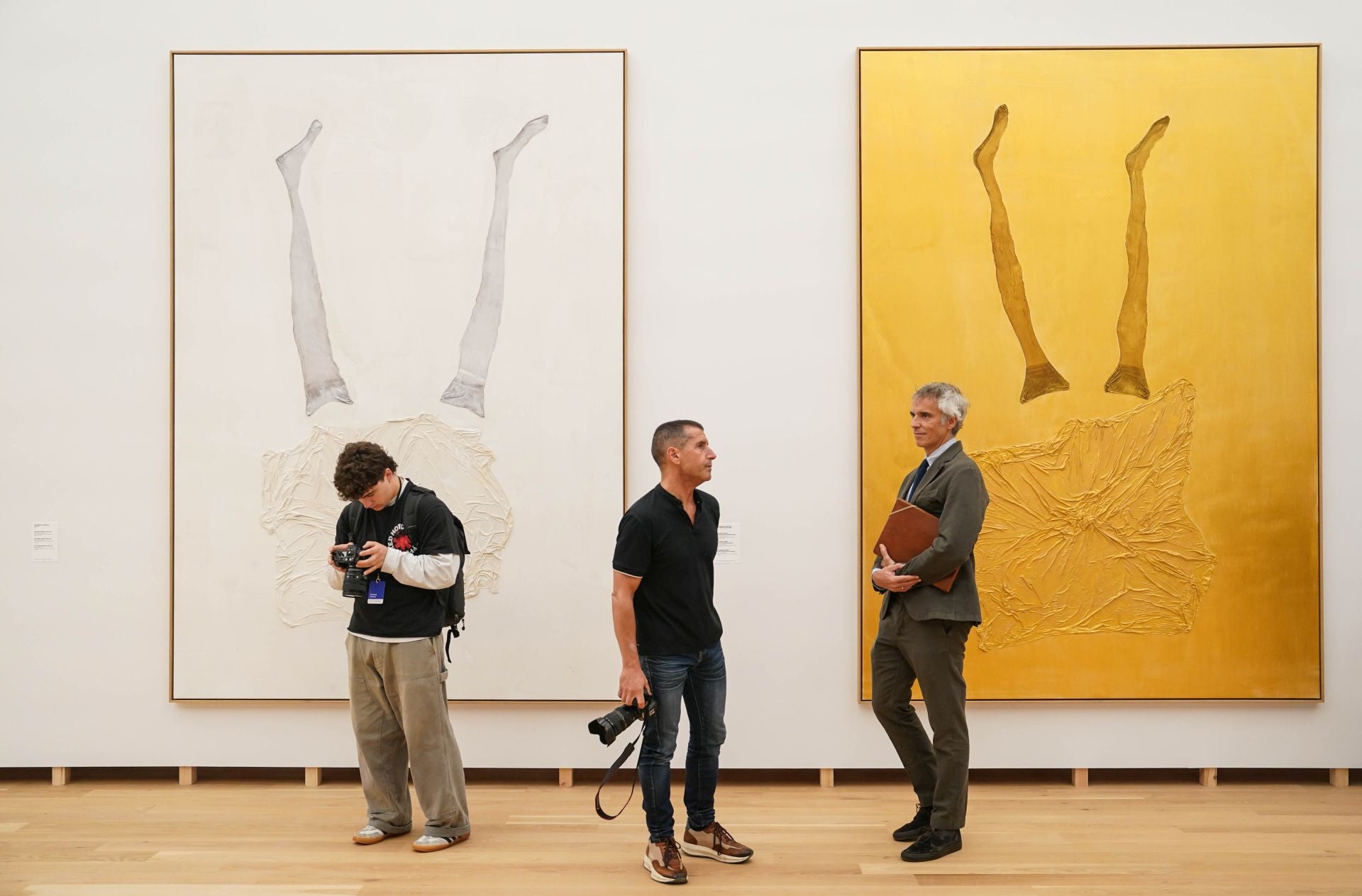 Los enormes lienzos (algunos de hasta casi cinco metros de alto por tres de ancho) abordan los temas que obsesionan al artista con imágenes impregnadas por la conciencia del cuerpo humano –casi siempre el suyo y el de su esposa, Elke–, su propia autobiografía y la historia del arte. «Figuras, manos, medias de nylon, piernas, pies y águilas imperiales condensan una nueva expresividad y la genial lucidez de su producción más reciente», explicó el director. Entre todas, una pintura de 2024 de cuatro metros y medio de ancho por tres de alto muestra un aguila imperial con medias y las alas abiertas cayendo (boca abajo), un símbolo de la heráldica alemana que ya usó en los 70; la titula con ironía 'No puedo tener sexo'. «Pero básicamente –prosiguió Rosenthal–, se pinta a él y a su mujer. En los cuadros se les ve duplicados, allí está Elke pintada cinco veces con medias de nylon reales, que coloca a modo de collage, y que pueden resultar un poco sórdidas o simplemente parecer un recuerdo. ¡Mi propia madre las llevaba!».