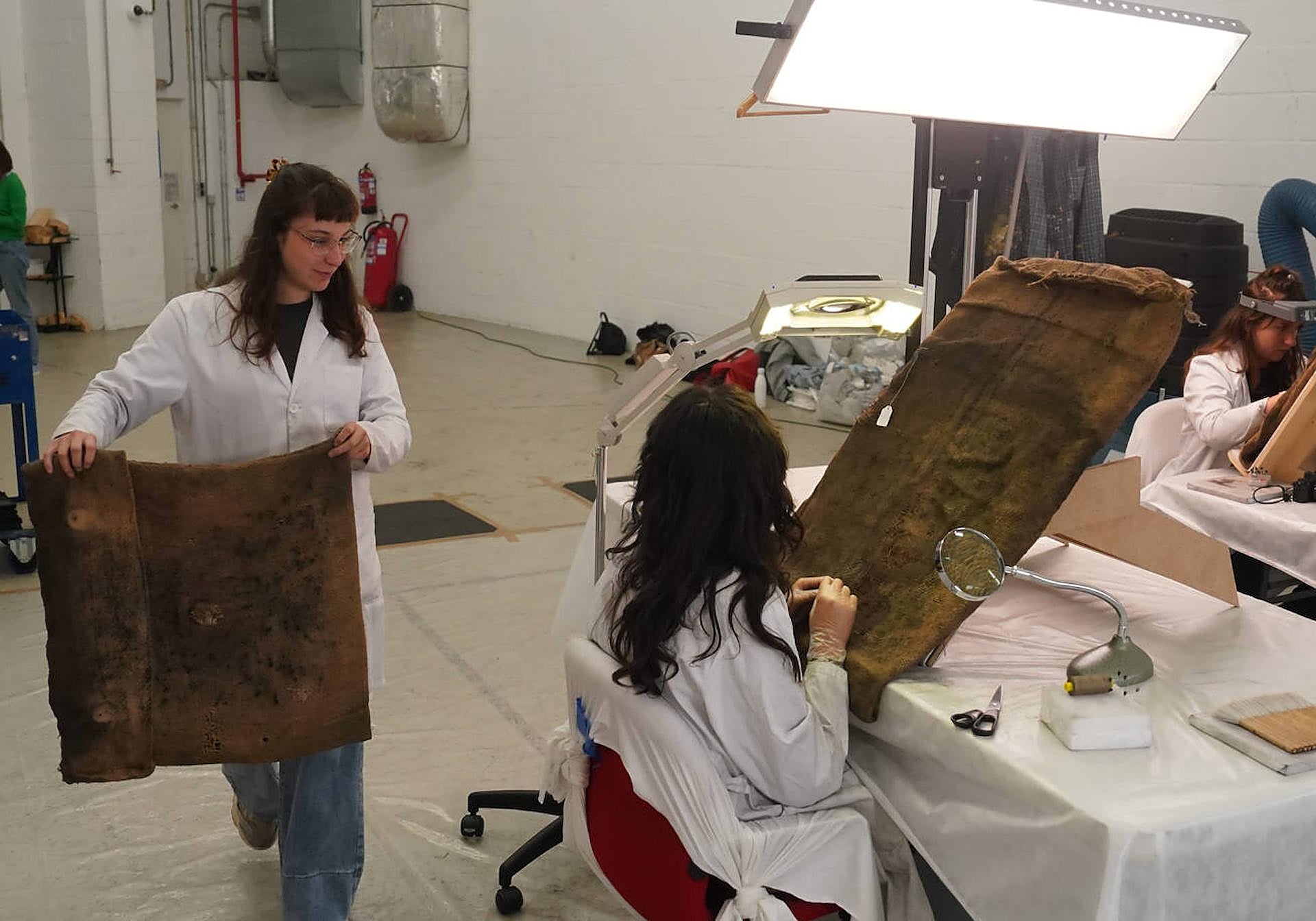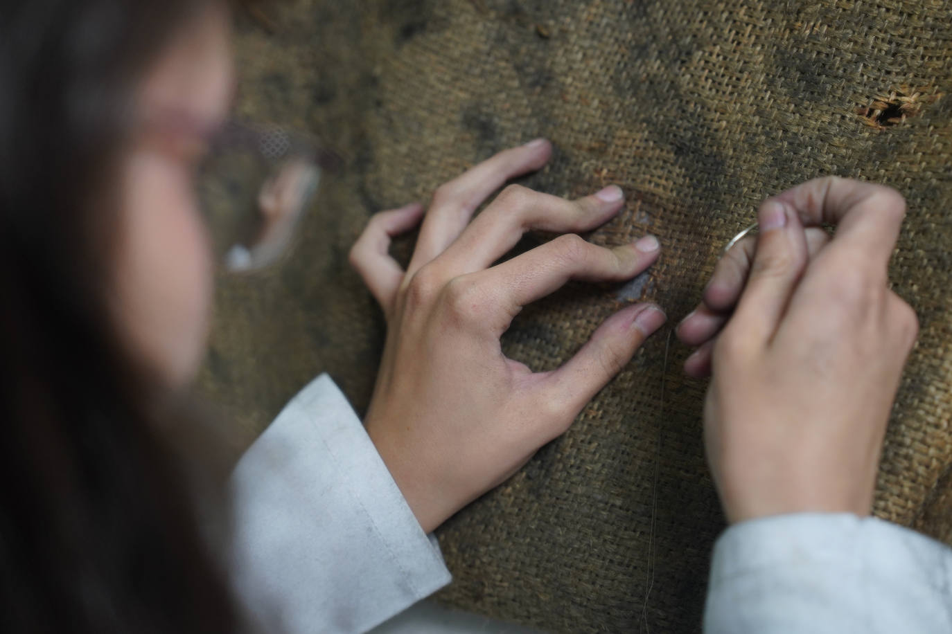 El trabajo busca consolidar los agujeros existentes tal como eran e impedir que se agranden. Para ello, refuerzan los bordes cosiéndolos con hilo de poliéster en una especie de atriles, con aguja plana o curva, por el derecho de la tela o por el revés, a gusto de los restauradores. Gracias a un convenio con la UPV hay estudiantes trabajando en este servicio. Hoy cosen sacos Miren Oteros, Dea Moreno, Lidia Hornero y Ane Martín, pero es el dinero que aportan los 33 miembros de honor del museo el que sustenta este servicio de Conservación del Guggenheim.