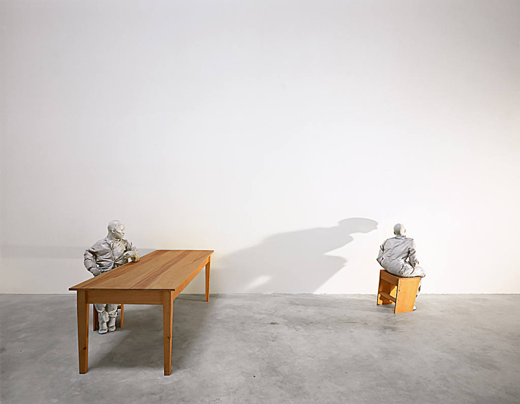 Atesora el Guggenheim una inquietante obra de JuanMuñoz, ahora en proceso de restauración. Dos figuras sentadas parecen haber discutido, pues una de ellas se encuentra dando la espalda a la otra, alejada y mirando de soslayo a la pared. Un mecanismo en su interior hace que la boca se mueva, como si estuviera hablando, y una luz proyectada sobre ella hace que ese movimiento quede patente en su sombra en el muro. Desvela Velasco que el sistema ha dado «un montón de problemas a lo largo de toda su historia: «Sufre de recalentamiento, y el mecanismo se ha ido desajustando». Han sustituido ejes, bielas... pero luego estaba la programación, «y como es antigua no había manera de obtenerla. Ahora sí que hacemos hincapié en que las obras vengan con un software libre, en código abierto, con toda la información, para tener en nuestra mano no solamente la obra física, sino lo que la compone. En este caso, en cuanto fallara la programación la íbamos a perder».