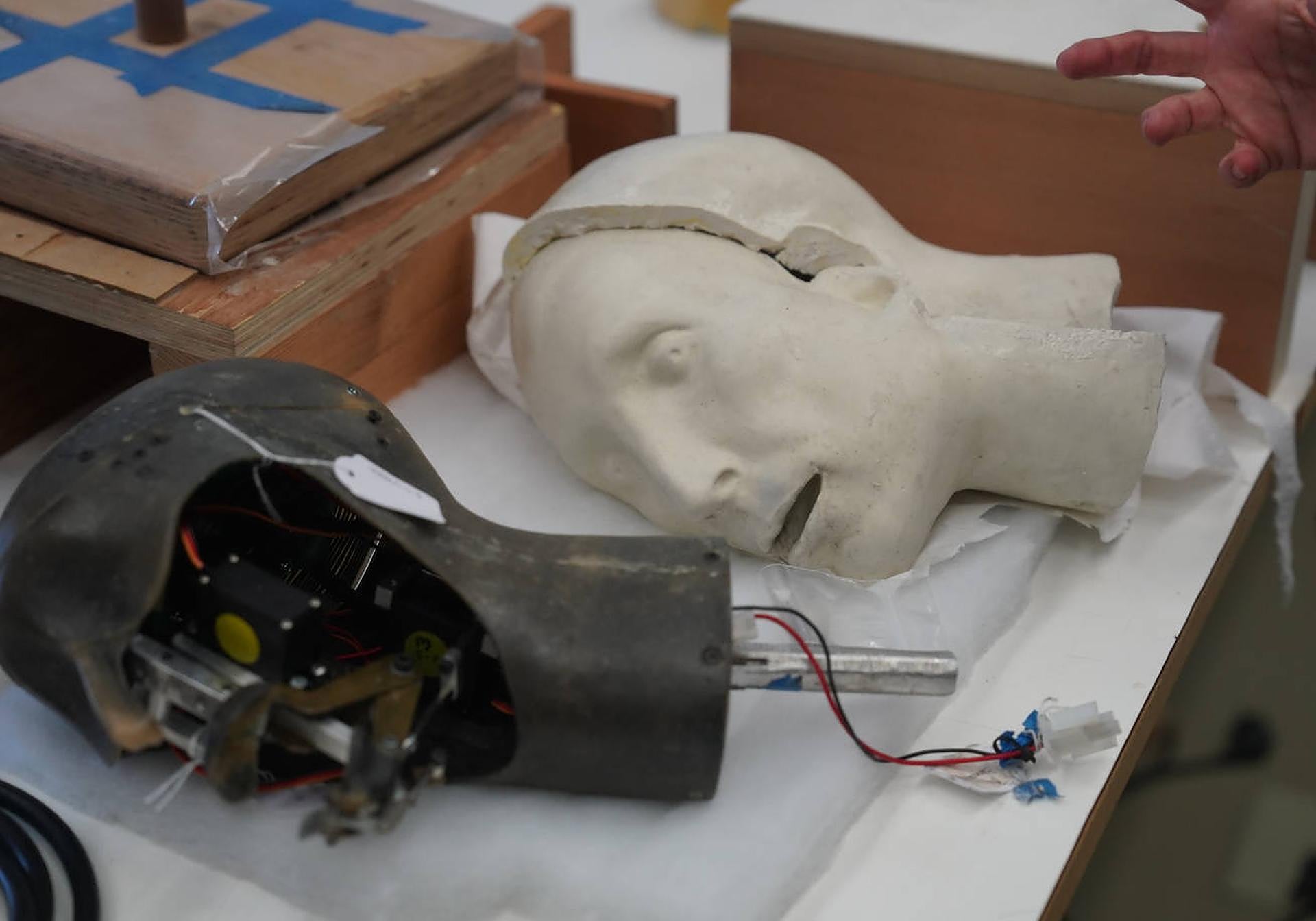 El Guggenheim tiene dos cabezas 'titulares' con un mecanismo totalmente diferente de tres ejes, tres motores que originan un movimiento muy parecido a lo que es hablar, tanto de abrir y cerrar la mandíbula como el de adelantarla y atrasarla. Y se construyeron en su día dos cabezas suplentes para cuando las buenas no funcionaran, «aunque con un sistema muchísimo más sencillo de dos motores solo, y entonces el movimiento era simplemente de apertura y cierre.. Lo que hemos hecho es intentar que las cabezas sustitutas se parezcan lo máximo a las originales con modificaciones en el interior, poniendo focos de ventilación y motores más potentes que no se recalienten tanto, para que la obra pueda aguantar funcionando ocho o nueve horas sin problemas, sin tener que estarla apagando todo el rato o cambiando las cabezas», explica la especialista.