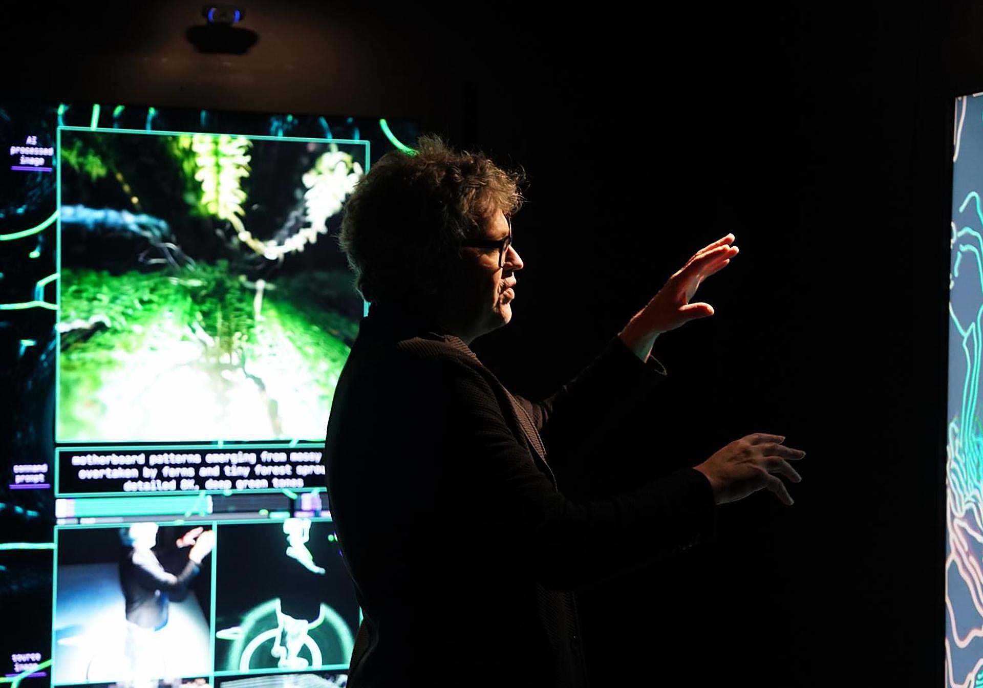 Vitale explica que esta parte funciona como una autobiografía imaginaria: «Hablamos de cómo nació la IA, cómo aprendió y cómo interpreta cosas imposibles para nosotros, antes de llevarnos hacia futuros imaginarios». La muestra incorpora también un mapa cronológico y una sala que reconoce la presencia de cada visitante mediante tecnología Kinect (detección de movimiento).