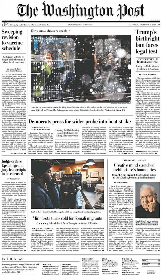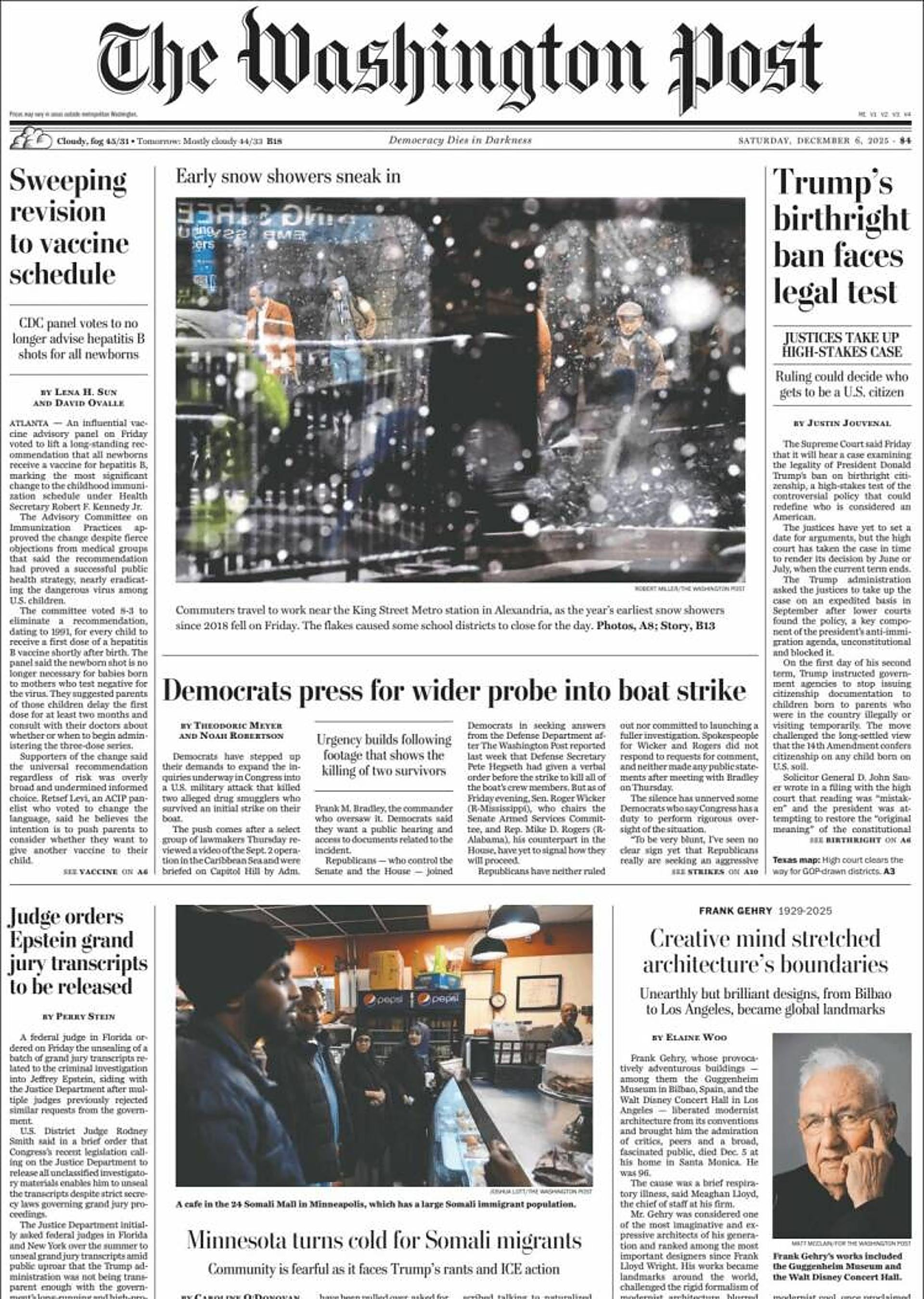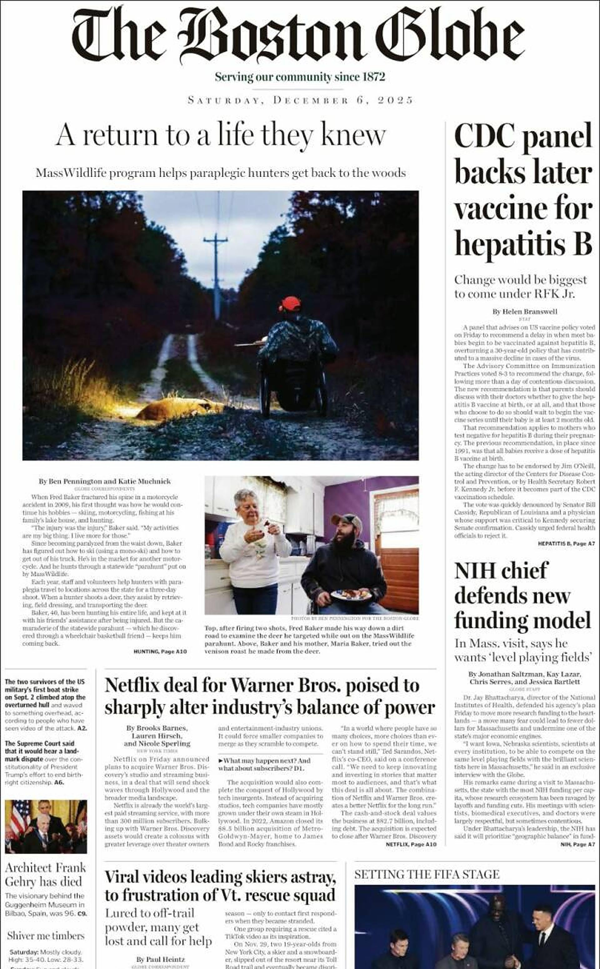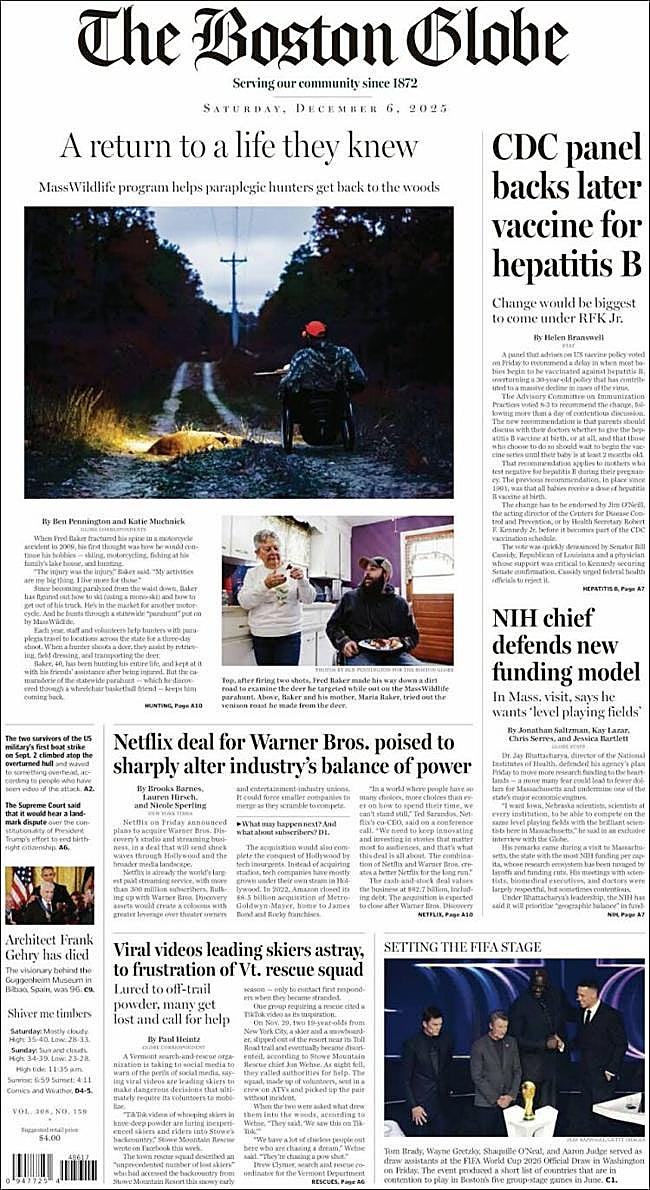 'Muere el arquitecto Frank Gehry, el visionario del museo Guggenheim de Bilbao', dice 'The Boston Globe', acompañando la llamada en portada de la fotografía en la que el presidente Obama entrega la Medalla de la Libertad al arquitecto.