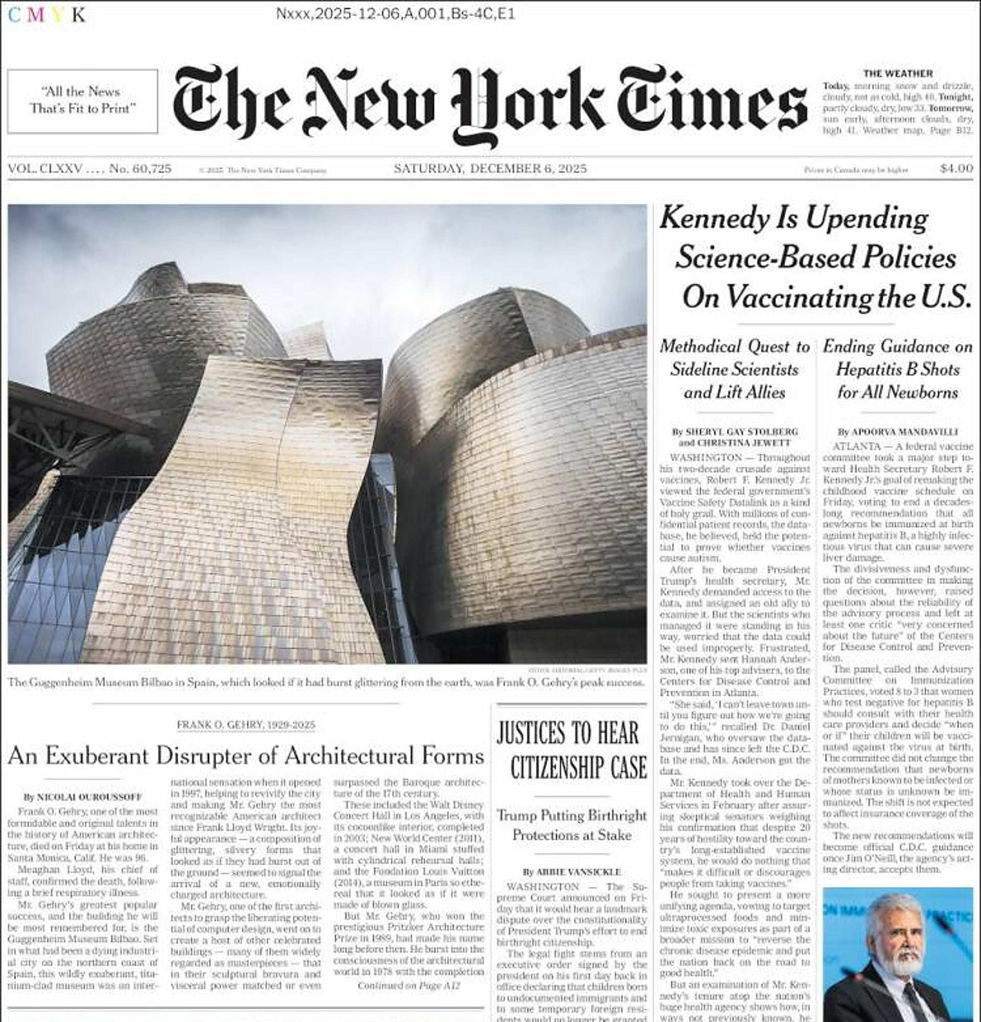 En Francia, ni 'Le Figaro' ni 'Le Monde' destacan la noticia en sus portadas pero sí la llevan en sus respectivas versiones digitales. 'Muere Frank Gehry, el arquitecto que torció las líneas', subraya 'Le Figaro', que le añade una pieza con sus cinco grandes obras y le califican como un maestro del deconstructivismo. 'El arquitecto que miró 300 millones de años atrás para reiventar su disciplina', titula 'Le Monde'.