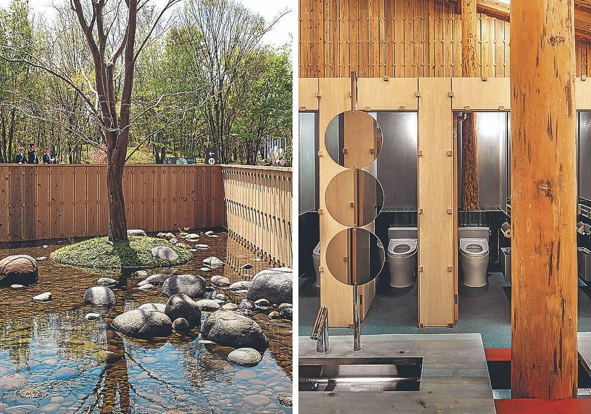 Dentro hay 40 cabinas con retretes y otros 20 urinarios para todos los públicos, aunque hay dos aseos reservados solo para mujeres y en el exterior hay inodoros accesibles para personas con movilidad reducida. Los arquitectos analizaron antes la gran variedad de situaciones que se pueden presentar al hacer uso de estas instalaciones: personas con una apariencia que no concuerda con su identidad de género, la dificulta de algunos padres para entrar en los baños con sus hijos de distinto sexo, o bien al revés, cuando hay que acompañar a los mayores. Señala Escobedo que al ser «este tipo de espacios para todos los géneros resultan poco comunes en Japón. Y señalizarlos bien tenía especial importancia. Para ello confiamos en el trabajo de la diseñadora gráfica bilbaína Angélica Barco (Ang Studio).