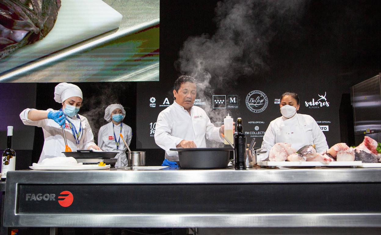 Gastón Acurio estuvo el lunes en el escenario de Madrid Fusión Alimentos de España 2022 para participar en el homenaje. Este miércoles, Perú siguió presente con la presencia de Héctor Solís, chef del restaurante Fiesta de Lima, que reivindicó los sabores del país andino centrándose en uno: el mero murique. «En el restaurante utilizo dos meros al día de unos 15-20 kilos, producto que nos permite mil y una elaboraciones: guisos, estofados, arroces, ceviches…», confesaba el chef.