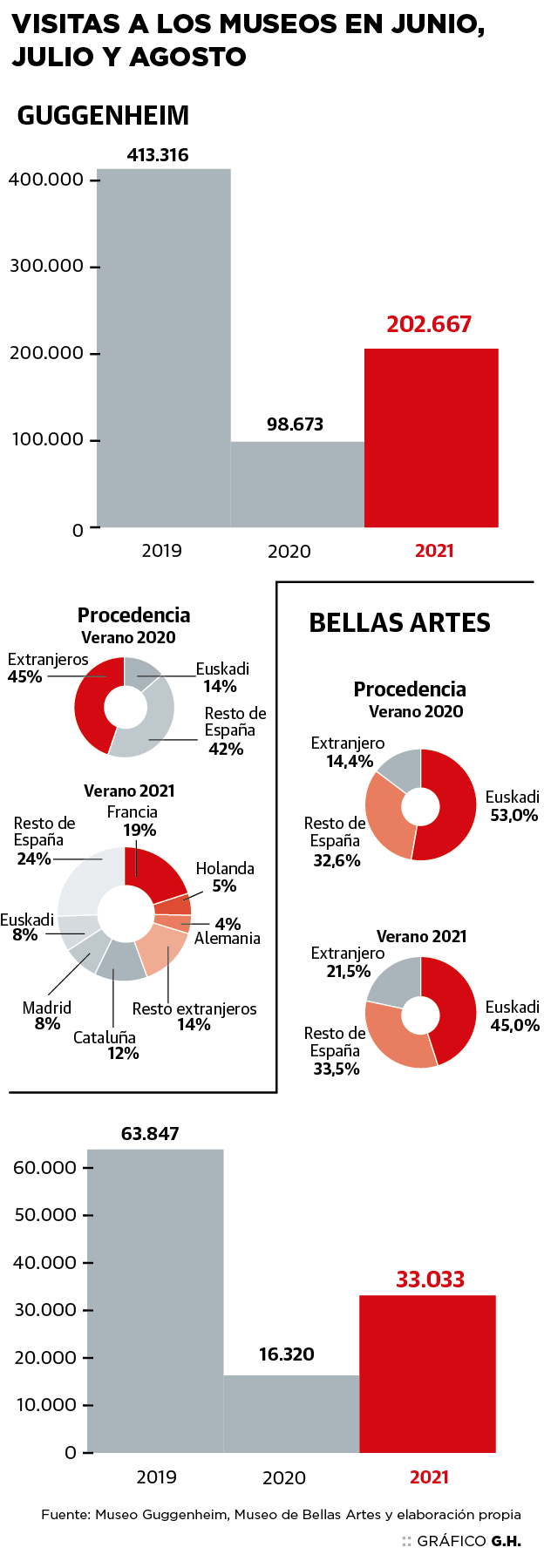 El verano ha dado un respiro al Guggenheim y al Bellas Artes. Un turismo nacional especialmente dinámico, ávido de novedades y nuevas experiencias, y el ... paulatino incremento de visitantes extranjeros a Euskadi han contribuido a reforzar la tendencia ascendente que ya se vislumbraba en julio. En estos tres últimos meses, los museos más relevantes de Bizkaia han conseguido duplicar la afluencia de público en comparación con el año pasado. El Guggenheim ha pasado de 98.673 a 202.667 visitantes, mientras que el Bellas Artes ha pegado el salto de 16.320 a 33.033.