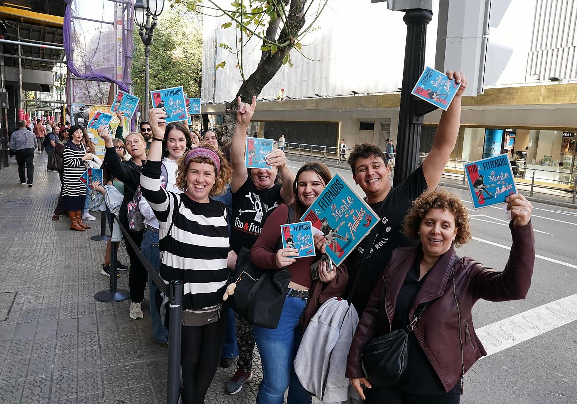 Unos metros más atrás, Juanjo e Ibone, de Bilbao, se toman la espera con humor. Él, con muleta y silla plegable, bromea con el «percal». «Conozco a Fito desde hace muchos años, pero nunca le había pedido un autógrafo», dice ella, sonriente. «Esto es para mi sobrina, aunque también le voy a dar un muxu grande». Con la camiseta oficial, han conseguido entradas para Bilbao y Logroño, y hasta traen un regalo para el artista: «Pero no te lo voy a decir, es sorpresa», guiña Ibone.