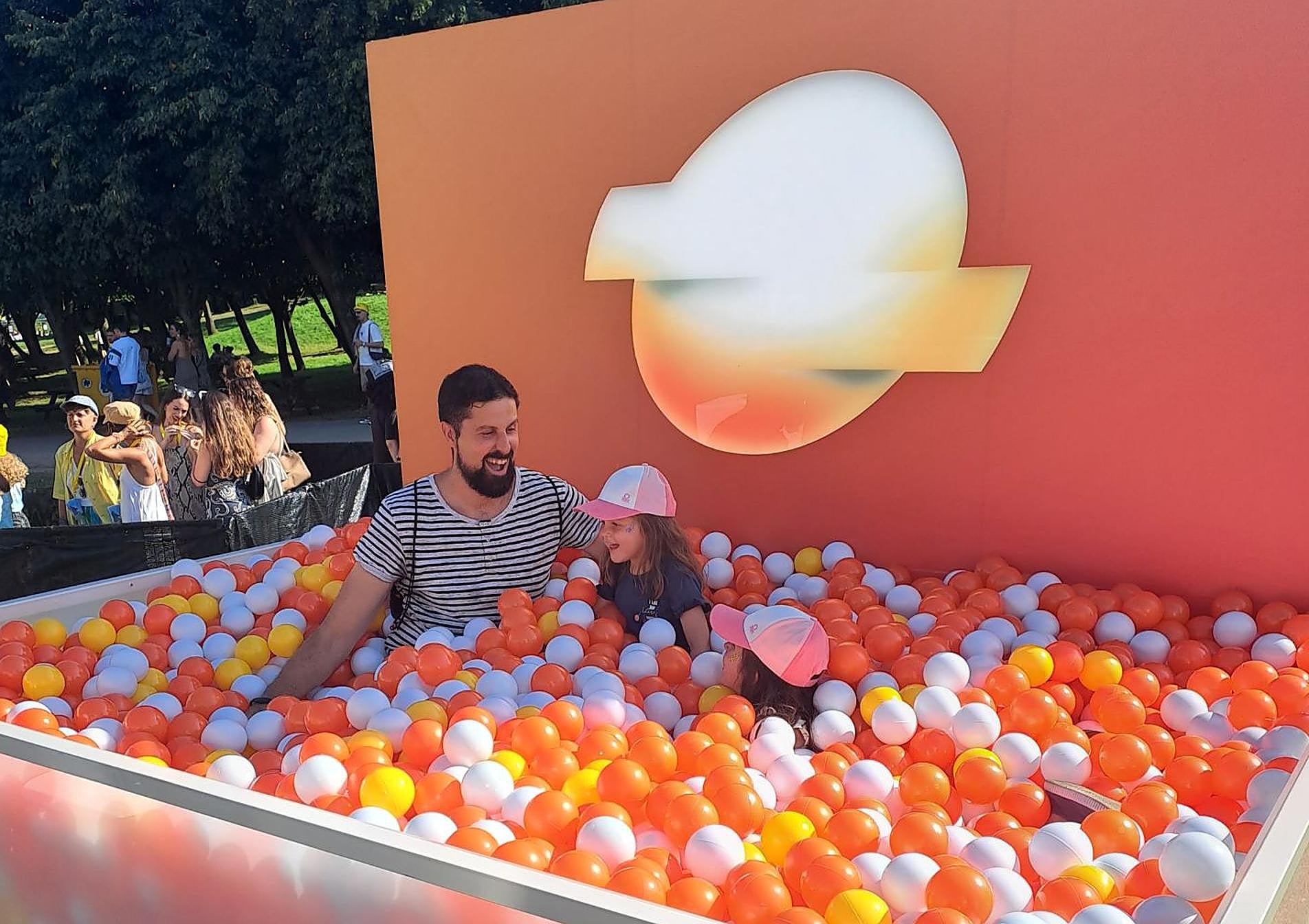 Es una de esas cosas que hacer nada más llegar o mientras se espera que empiece el bolo. Por cierto, que el colmo de este tipo de experiencias era montar en los desaparecidos autos de choque del Azkena, pero en Kobetas, hay unas cuantas. Todas patrocinadas, que aquí la publicidad es descubierta, y la primera es la de Repsol, casi a la entrada. «Este es un punto de recarga de energía solar para tu móvil, pero además te hacemos un maquillaje para que brilles con toda tu energía y luego te hacemos un 'reel' (vídeo corto) desfilando por esta pasarela, y si quieres lo compartes en redes», explica Marta Díaz, una de las responsables de stand. Y las que brillaban eran Ariane y Elba, 5 y 3 años, hijas de Maitane y Héctor, que ya van por su segunda vez en el festi: «Vinimos con ellas el año pasado e hicimos todo el recorrido de estos puestos. Están muy bien para ellas, también disfrutan con la música, pero participar en estas cosas las divierte», explicaba la madre mientras ellas ya nadaban en la piscina de bolas.