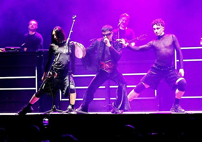 Rodrigo Cuevas, artista del régimen, algo así como Almodóvar hace tres décadas, actuó en septeto: él, la pareja de baile mixta, y cuatro músicos sintéticos que tocaban en directo combinando bases, percusiones, guitarra y coros. Si les sumamos los cinco miembros de su equipo que no se vieron (conductor, manager y tres técnicos), sale que la caravana de Cuevas la compusieron trece personas. Esos trece, más el mogollón de trabajadores del Aula de Cultura de Getxo (fotógrafos, seguratas, montadores...), fueron necesarios este viernes para montar un show de 92 minutos y 15 temas, incluyendo el baile final de despedida de los siete actuantes al son del 'Woman del Callao' de Juan Luis Guerra. Y muy importante: quizá una hora fue de música y media de cháchara.