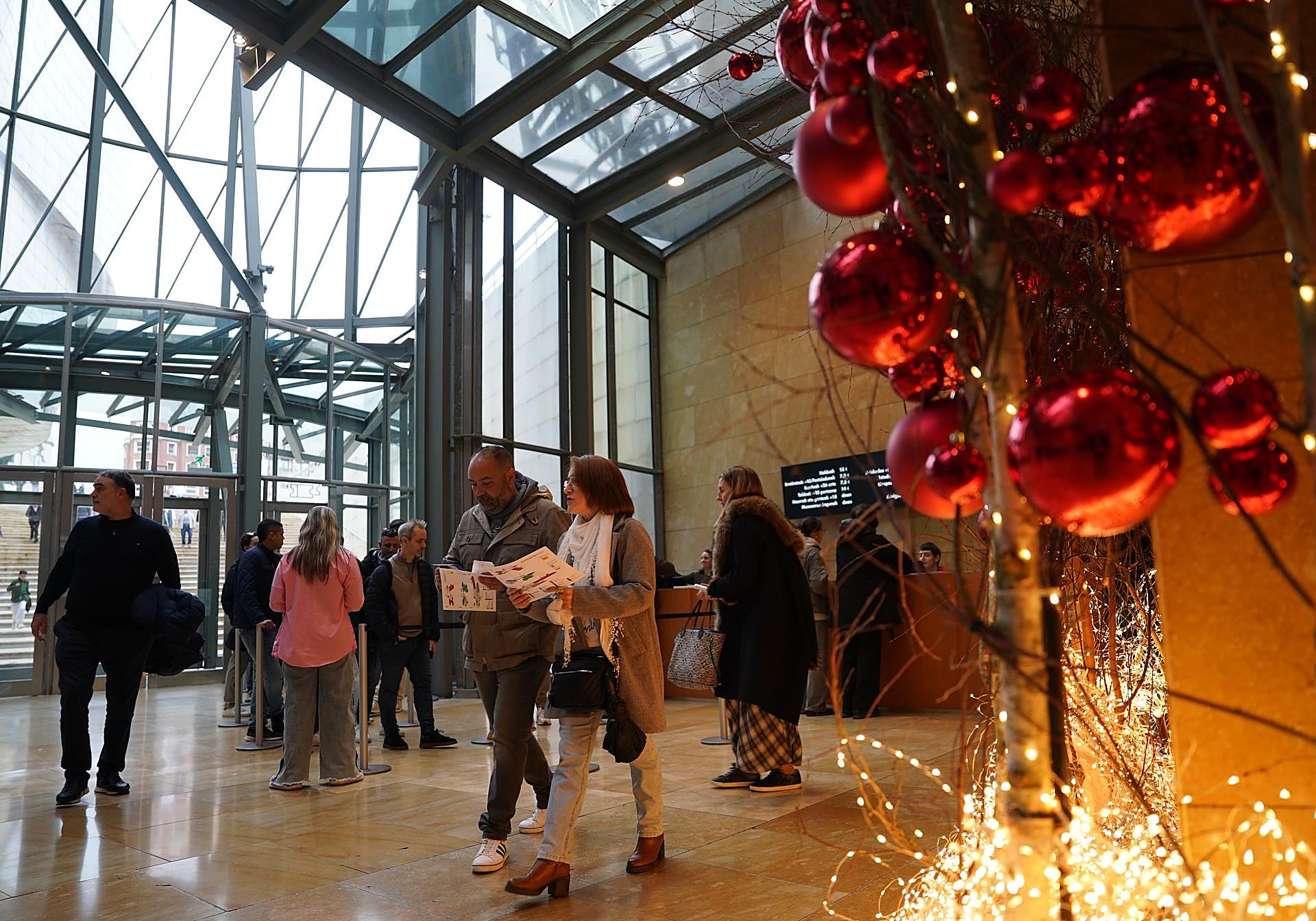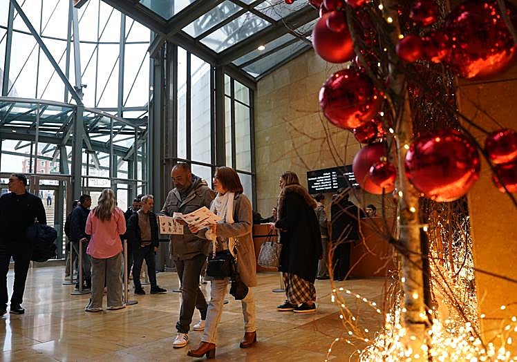 Para ellos, sin embargo, la sorpresa ha llegado en el interior. «Las formas orgánicas, la mezcla entre cristal y metal… nos ha fascinado, no nos esperábamos encontrarnos con algo así», explican aún emocionados. Y es precisamente ese juego de pasarelas, curvas y ascensores de titanio que conecta los tres pisos del edificio lo que busca dialogar con la luz y reivindicar el pasado industrial de Bilbao a través de su esqueleto de acero. «Conocíamos parte de la historia de la ciudad, pero nos cuesta imaginar toda esta zona tan bonita llena de humo y fábricas», bromean Olivia y Lucas, dos estudiantes de Erasmus procedentes de California que llevan desde septiembre en la villa.