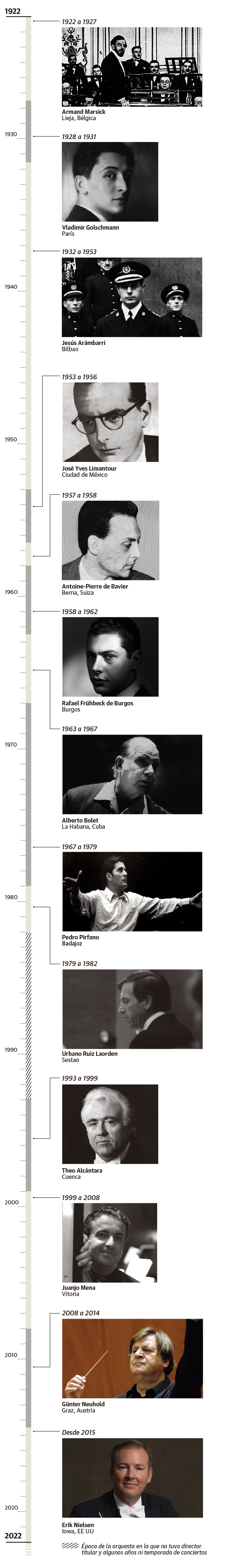 La Orquesta Sinfónica de Bilbao (BOS) se presentó en sociedad el 8 de marzo de 1922 en el Teatro Arriaga con un programa confeccionado con obras de Bizet, Saint-Saëns, Svendsen, Dvorák, Wagner y Lalo. Un repertorio que hoy se antoja largo y extrañamente ordenado y que fue dirigido por el belga Armand Marsick. Desde ese momento a hoy, han pasado cien años en los que la orquesta creció, atravesó momentos de crisis, se consolidó y alcanzó hitos relevantes como el concierto que protagonizó en 2003 en el teatro Mariinsky de San Petersburgo. Esta es una historia visual de la Orquesta Sinfónica de Bilbao que complementa a la que César Coca relata en este reportaje.