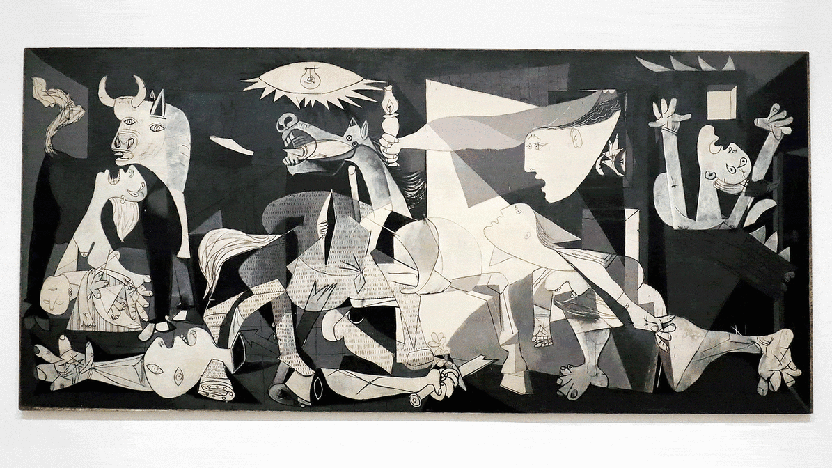 Entre el cubismo y el surrealismo, Picasso erige un poderoso alegato contra la guerra que se expresa tanto en la paleta monocroma como en los ojos de los personajes, peces aterrorizados que se revuelven sin escapatoria.