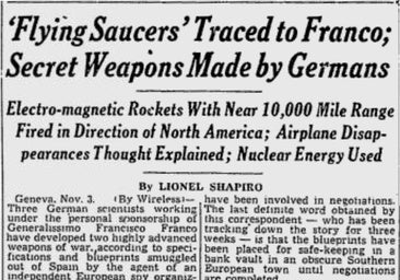Tras las primeras visiones de platillos volantes, cuando casi nadie hablaba de extraterrestres, varios periódicos canadienses y estadounidenses apuntaron a un origen español. «Platillos volantes rastreados hasta Franco; armas secretas diseñadas por alemanes», alertó 'The Gazette' de Montreal en primera página el 4 de noviembre de 1947. La exclusiva la firmaba Lionel Shapiro, que desde Ginebra alimentaba la idea de que los misteriosos objetos eran un invento humano, lo que entonces preocupaba al Pentágono, con la mirada puesta en la Unión Soviética.