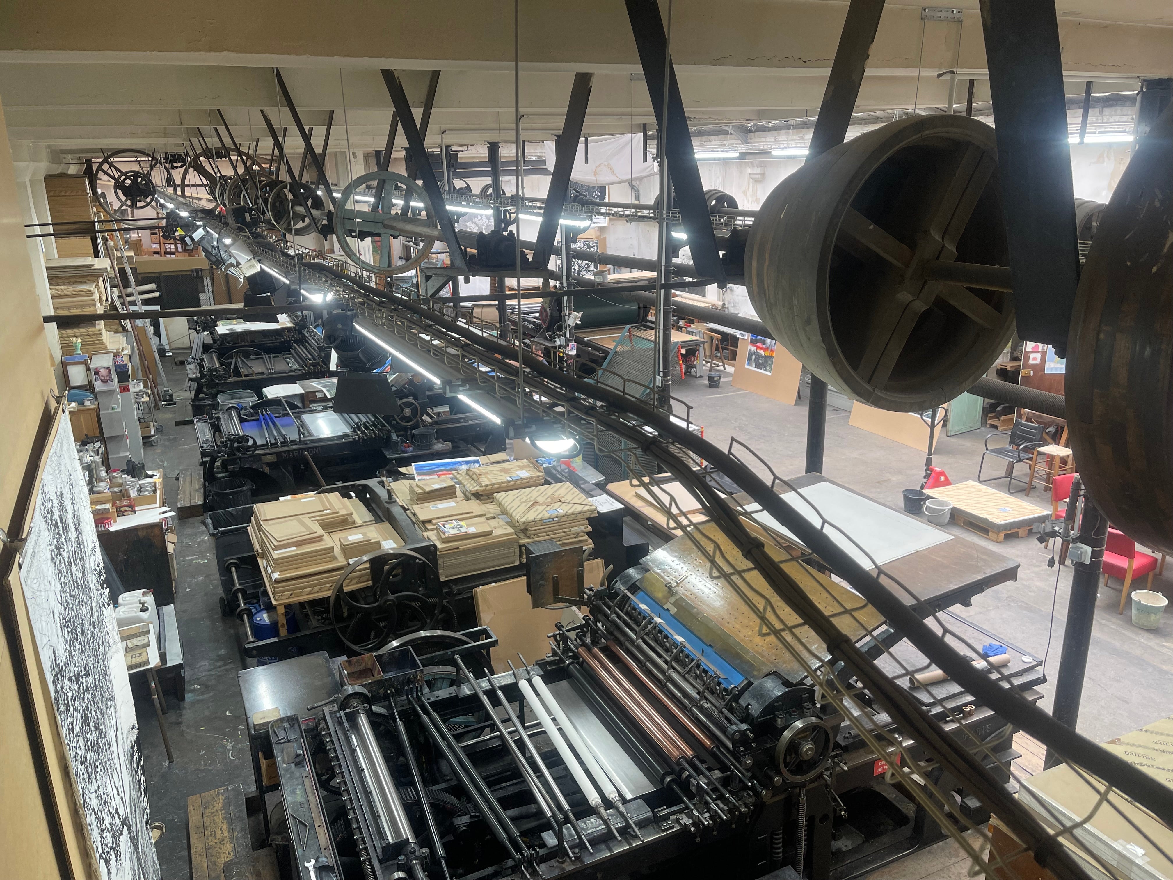 A partir de esa exposición en la galería parisina, Lynch descubrió un lugar clave en su fecunda relación artística con la capital francesa: el taller Idem. Situado en el número 49 de la calle Montparnasse, a pocos minutos andando de la estación de trenes y la torre homónimas, en la rive gauche (sur de la capital), la visita a esta imprenta parece un viaje al París decimonónico. Ese pasado está presente desde la entrada, con una placa que recuerda que este edificio haussmaniano perteneció a Eugène Dufrénoy, un conocido fabricante de mapas a finales del siglo XIX. En 1976 Fernand Mourlot instaló ahí sus imprentas, las mismas que habían servido para crear las litografías de Pablo Picasso, Joan Miró o Marc Chagall.