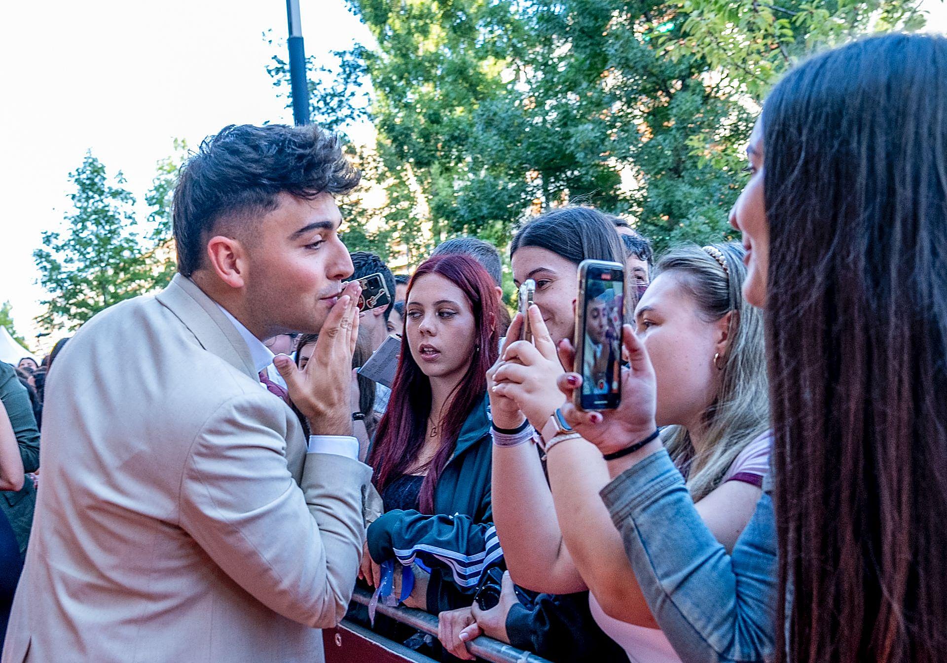 La pasarela de la Avenida contó con varios grupos de asistentes desde primera hora de la mañana para ir cogiendo sitio en primera línea de alfombra. ¿El motivo? «Queremos ver a Juanjo Bona» (el concursante que se dio a conocer en 'OT' 2023), explicaban Maialen, Ruth, Laura y Rocío antes de arrancar el particular paseíllo de famosos. Estas cuatro jóvenes estudiantes de la capital alavesa habían acudido equipadas con botellas de agua, bocadillos y naipes para pasar el rato. El aclamado 'extriunfito' confesó que de Vitoria y el País Vasco «me gusta todo; clima, gente, comida, paisajes...».