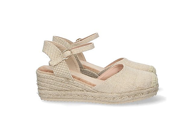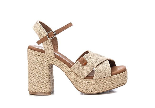 u pala ancha cruzada en material textil y la correa con hebilla abrazan el pie con suavidad, mientras el tacón de yute de 9 cm y la plataforma proporcionan altura sin sacrificar el confort.