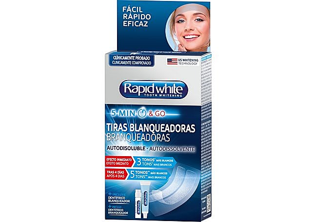El kit de blanqueamiento dental RapidWhite está diseñado para uso doméstico e incluye una pasta blanqueadora, gel, moldes moldeables y un acelerador. El sistema permite adaptar el tratamiento a la dentadura de cada usuario y puede lograr hasta siete tonos más claros sin utilizar peróxido de hidrógeno.