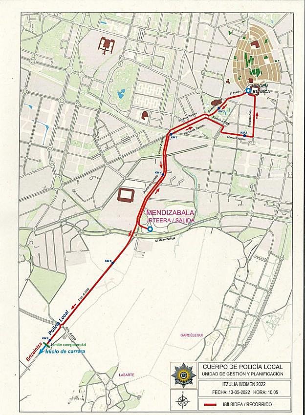Se producirá entre las 10.05 y las 10.23 horas. El pelotón partirá del aparcamiento de Mendizabala. Desde allí, atravesará las calles Portal de Lasarte, Elvira Zulueta, Portal de Castilla, Ramón y Cajal, paseo de La Senda, Manuel Iradier, Dato, Postas, plaza de la Virgen Blanca, Prado, Cadena y Eleta, Micaela Portilla, Avenida Gasteiz, Elvira Zulueta, Portal de Lasarte – carretera A-3102 – y Berrosteguieta.