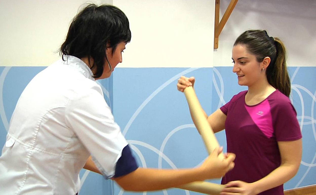 La fisioterapeuta Naiara Páramo, del centro Igaro, enseña unos sencillos movimientos para perder la sensación de miedo después de haberse salido el hombro
