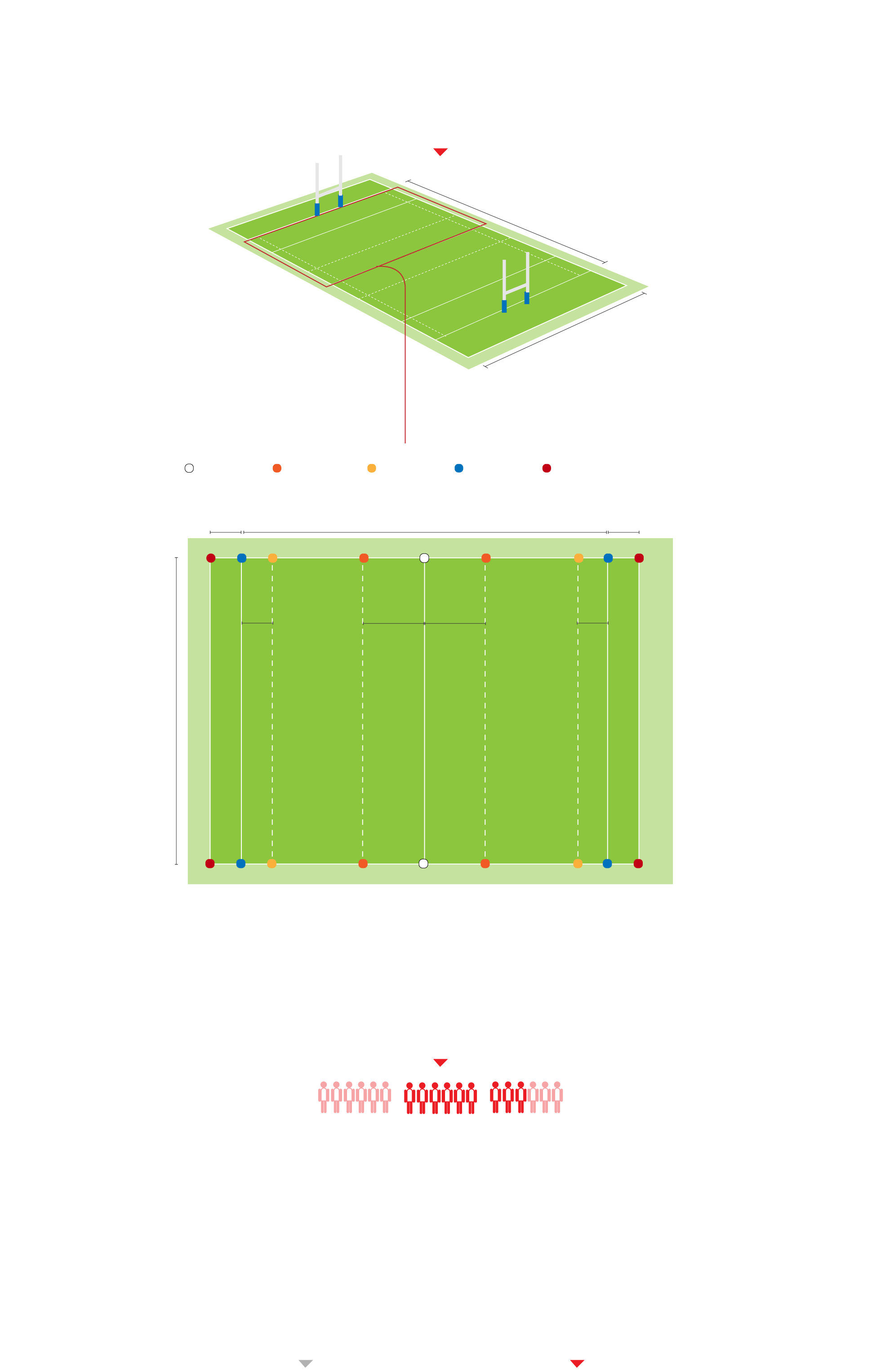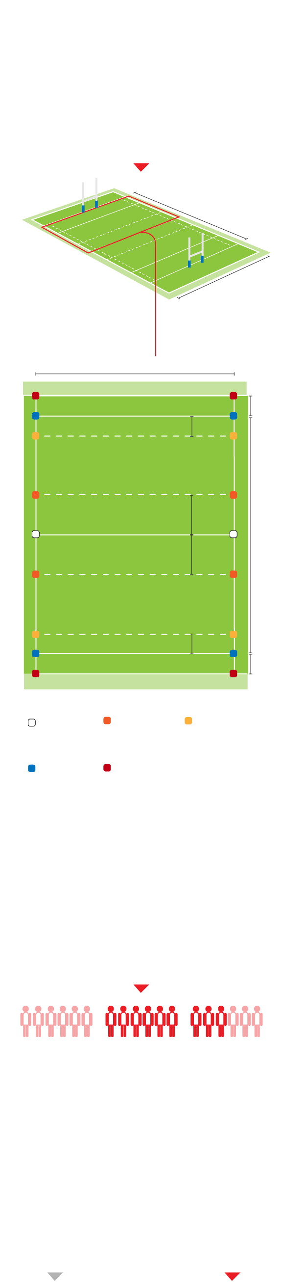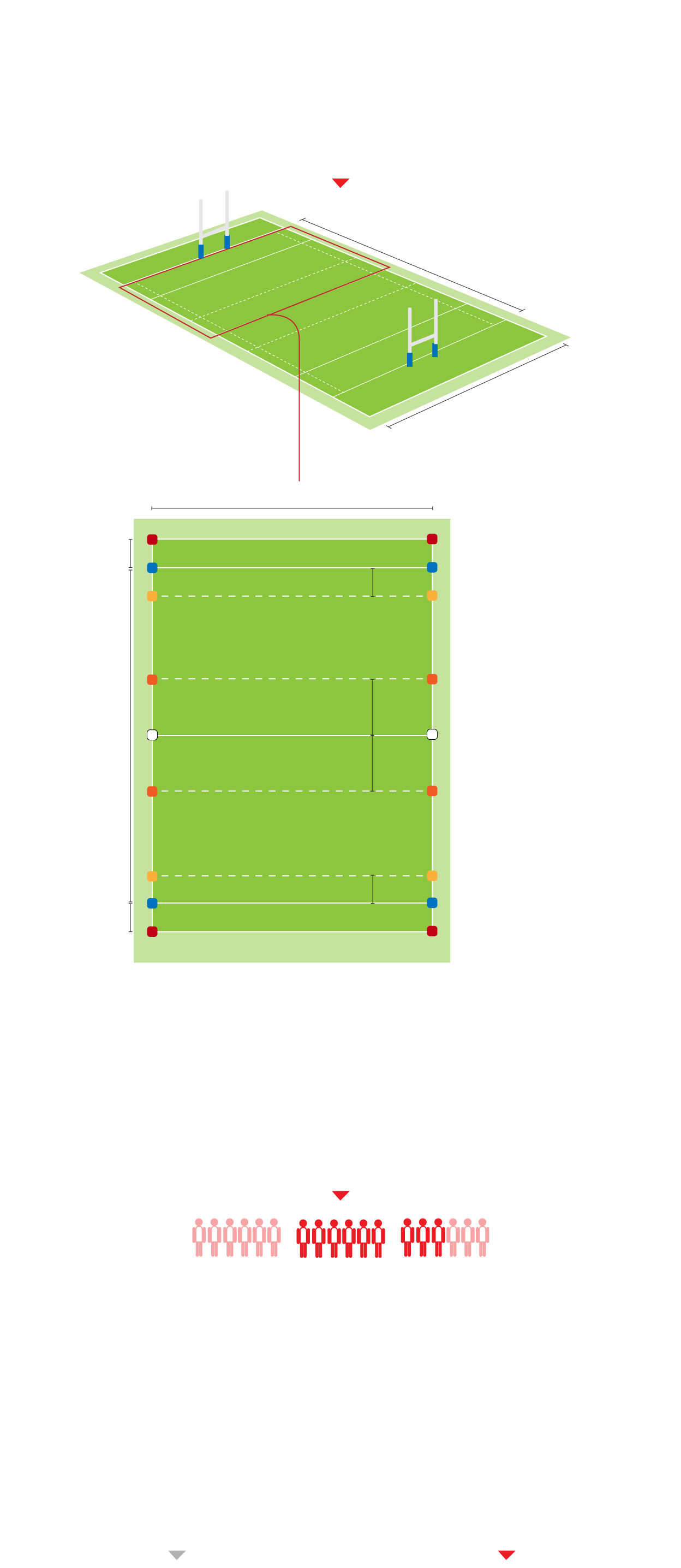 Normalmente los partidos se juegan en una mitad de una cancha de rugby con las líneas de goal y de mitad de cancha actuando como líneas laterales
