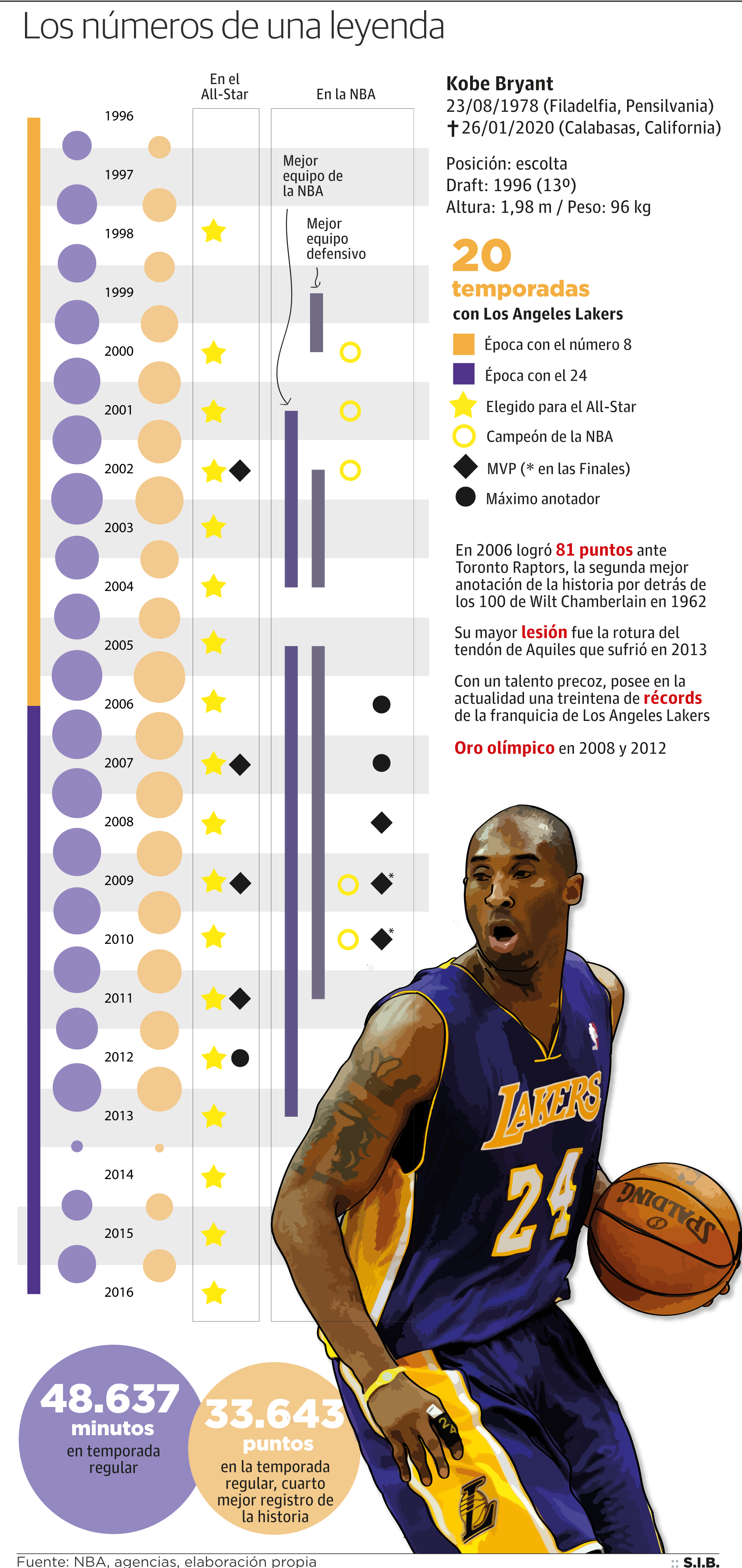 La leyenda de Kobe Bryant trasciende sus múltiples gestas en las canchas de baloncesto. Cuarto máximo anotador de la historia de la NBA, cinco veces ganador del anillo que reconoce a los campeones de la competición reina del deporte de la canasta, dieciocho veces All Star y detentador de dos oros olímpicos, la 'Mamba Negra' fue un mito dentro de las pistas y un genio fuera de ellas. Una figura poliédrica que extendió sus tentáculos sobre diversos ámbitos a los que trasladó, casi siempre con el mismo éxito con que descerrajaba el aro rival, la ambición que le convirtió en el referente por antonomasia de la segunda franquicia más laureada de todos los tiempos.