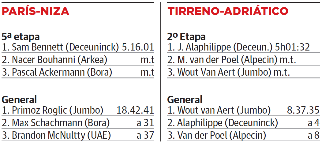 Sam Bennett (Deceuninck) ganó la quinta etapa de la París-Niza, con final en Bollène, logrando su segunda victoria al sprint de esta edición. Primoz Roglic (Jumbo) conservó el maillot amarillo pese a una caída. El esloveno se fue al suelo a 37 kilómetros de meta junto a su compañero Tony Martin.