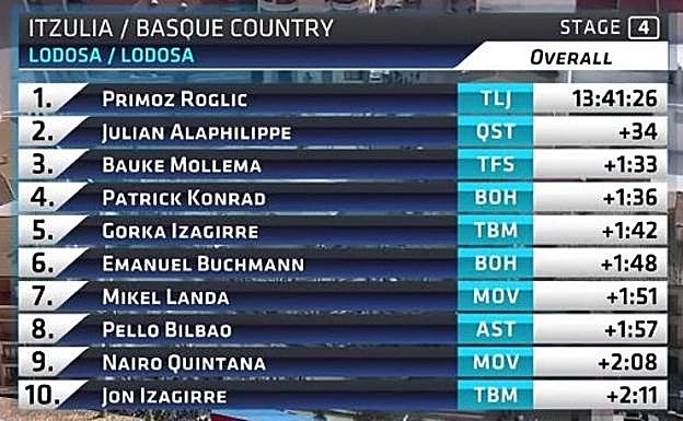 Roglic pasa a ser también el nuevo líder de la Itzulia 2018, adelantando a Alaphilippe, que se mantiene segundo. Mollema es el tercer clasificado.