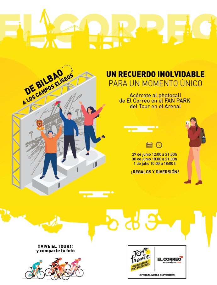 Los visitantes que se acerquen al puesto de EL CORREO podrán disfrutar de un photocall donde podrán sentirse como auténticos ganadores del Tour de Francia. Sentirán que están en los Campos Elíseos de París con el maillot amarillo de líder y podrán levantar la copa. Y además de la foto, este periódico regalará miles de llaveros del Tour.