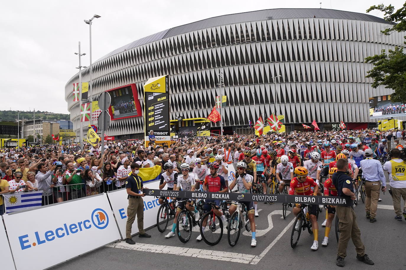 La salida se ha dado puntual. A las 12.30 horas, los 176 corredores, pertenecientes a los 22 equipos participantes, han salido de San Mamés. Fotos, regalos para el numeroso público, aplausos, música, trenes llenos de gente hasta la bandera… Y muchos visitantes de fuera de Euskadi. Que de eso también se trataba. Traer el Tour ha costado 14 millones, pero los minutos de televisión, con esas imágenes magistralmente recogidas por los helicópteros, tienen un valor publicitario muy reseñable. San Juan de Gaztelugatxe, la ola de Mundaka, la playa de Bakio, el puerto pesquero de Bermeo, el castillo de Butrón... El retorno de este evento será también importante en hoteles y locales hosteleros. Y no solo este año, habrá que estudiarlo también a corto y medio plazo.