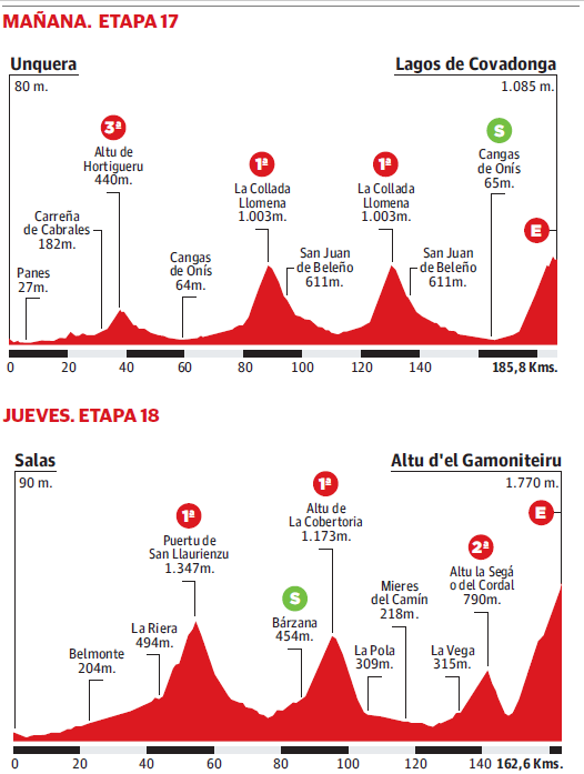 Día de transición hoy en Cantabria antes de las dos etapas infernales de Asturias mañana y pasado. Dos finales en puertos de categoría especial como Lagos de Covadonga y Gamoniteiru, precididos ambos por otras tres duras ascensiones.