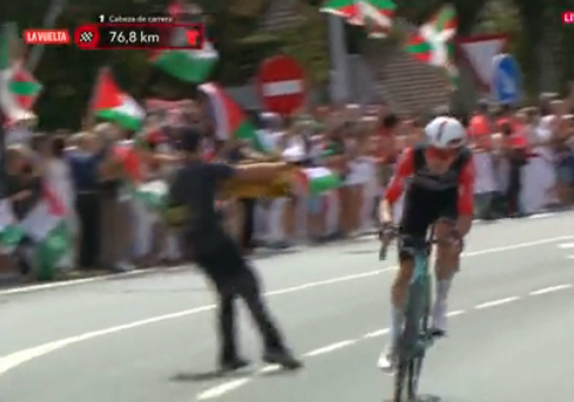 El pelotón de la Vuelta sufrió un nuevo sobresalto a su paso por Navarra. En la zona de Lumbier, varios manifestantes irrumpieron al paso de los ciclistas. Portaban banderas palestinas. Los agentes que velaban por la seguridad actuaron con rapidez para retirarlos de la calzada, pero se vivieron momentos de tensión. Ese día hubo protestas en los 16 pueblos por los que pasaron los corredores.