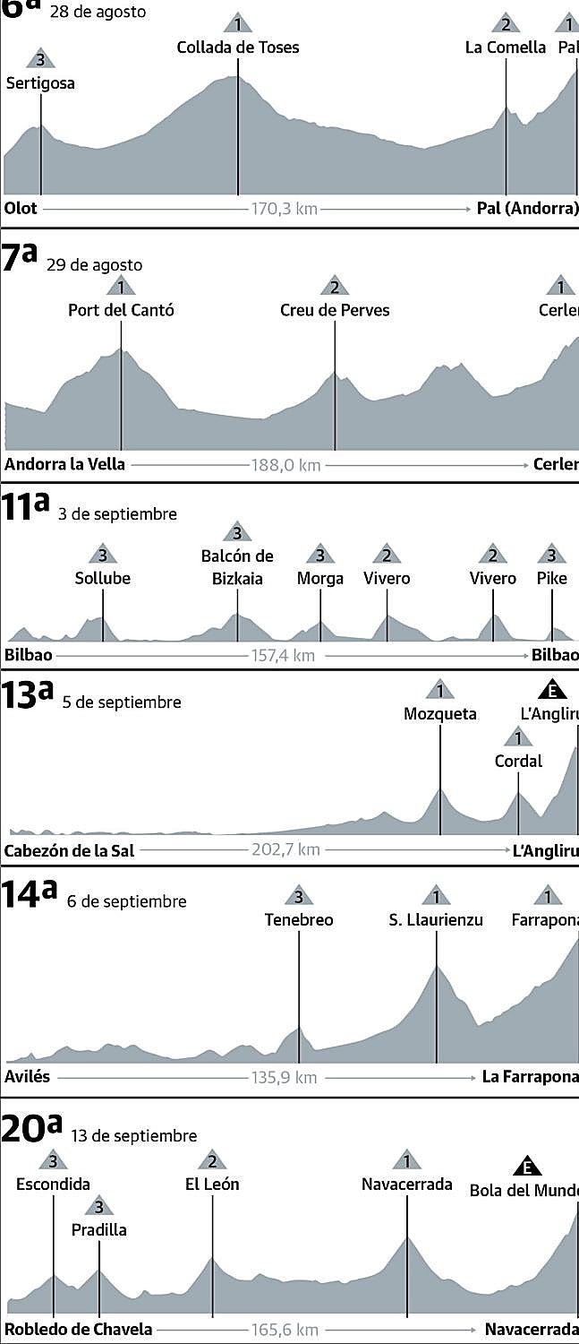 «Hay muchas etapas para marcar la diferencia», vislumbra Vingegaard sobre un recorrido clásico de la Vuelta. Etapas cortas y muchos finales en alto, esta vez en cimas icónicas para celebrar los 90 años de la prueba (80 ediciones debido al franquismo y a la guerra). Se sale de Italia, pero sin ninguna visita a los lugares representativos del Giro. También se pasará por los Alpes en una etapa más propicia para sprinters. La contrarreloj por equipos de Figueras hará las primeras diferencias antes de las dos primeras jornadas de montaña, en Andorra y Cerler, de regreso. Las trampas de Bilbao las conoce el danés del Tour del 2023, así como los finales en el Angliru y La Farrapona y la contrarreloj individual de Valladolid. Para el final queda la Bola del Mundo, con los ecologistas reclamando que se trataría de una actividad dañina para el medio ambiente. «Estoy aquí por la victoria general y preferiría empezar a competir de inmediato», culmina Vingegaard, el gran favorito al rojo.