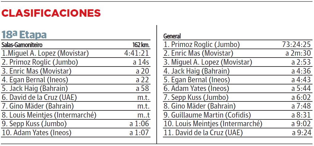 La cuarta carta, Enric Mas, sacrificó su opciones de vencer en la etapa. Se sabía muy vigilado por Roglic. Así que dio vía libre a 'Superman' López, que remató el trabajo y que, nada más bajar del podio, compartió su victoria. «La labor de Imanol, Nelson, Rojillas, Enric… han hecho un magnífico trabajo. Significa mucho para nosotros. Solo los que estamos aquí dentro sabemos el gran trabajo y el sufrimiento que se pasa día a día. Esto no es solo hablar y criticar», dijo como respuesta a las críticas recibidas el miércoles después de que ni Enric Mas ni él estuvieran en el ataque lejano de Bernal y Roglic camino de los Lagos de Covadonga. Redimidos.