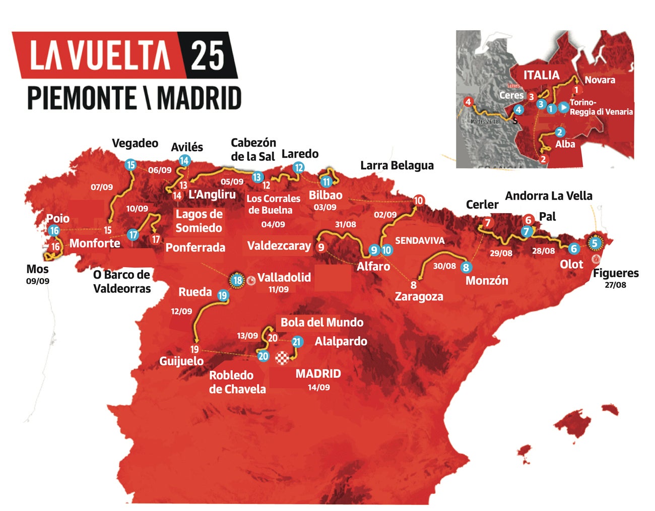 La Vuelta del 90 aniversario será la Vuelta del Norte. Más allá de las tres etapas en el Piemonte italiano y una cuarta en Francia, será un recorrido donde Madrid, en la etapa final, será el punto más al sur de esas tres semanas de carrera. Catalunya, Andorra, Aragón, Navarra, Euskadi, Cantabria, Asturias, Galicia, Castilla y León y Madrid serán las comunidades que reciban a la Vuelta de 2025, quedando media península fuera del trazado.