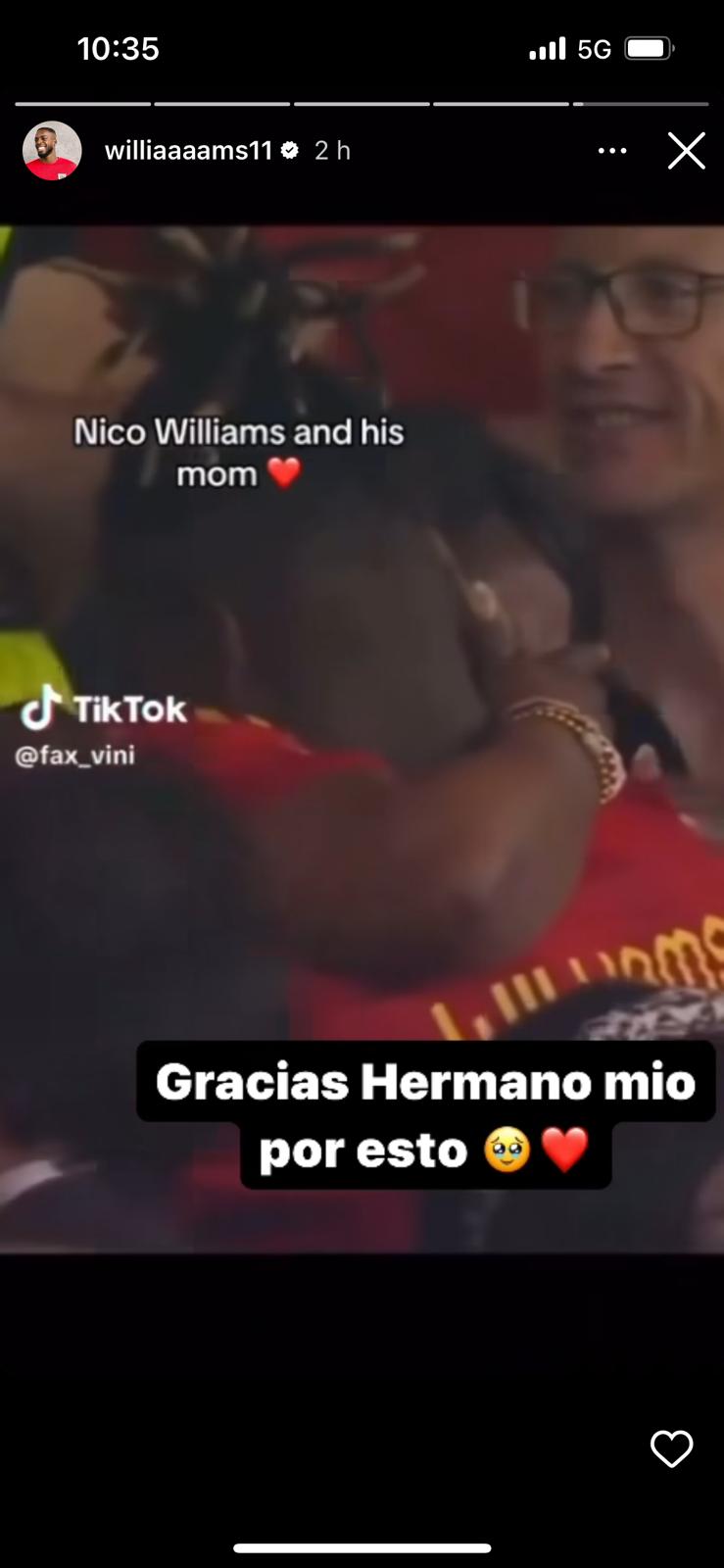 Ya después del partido, con Nico como campeón de Europa, Iñaki Williams se hizo eco del vídeo en el que su madre y su hermano se abrazaban en la grada. Lo compartió con gran emoción: «Gracias hermano mío por esto».