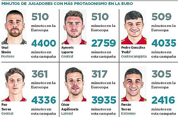 El seleccionador nacional ha conformado un bloque fácilmente identificable en el que hay piezas inamovibles. Unai Simón y Aymeric Laporte han jugado todos los minutos de esta Eurocopa (510), y Pedri solo se ha perdido uno porque fue sustituido en la recta final del duelo ante los suizos (509). En este club de los indiscutibles entran también Jordi Alba (433), Koke (411), Morata (393) y Busquets (292) -se perdió los dos primeros choques por el coronavirus-, entre otros, sin olvidar los ya muy empleados Pau Torres (361), Azpilicueta (317) y Ferran (305). Pero estos registros son solo la punta del iceberg, que debajo de la superficie contabiliza los correspondientes recorridos en los respectivos torneos domésticos e internacionales.