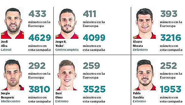La columna vertebral de España soporta muchas horas de fútbol, con cinco futbolistas por encima de los 4.000 minutos y otros tantos superando los 3.200